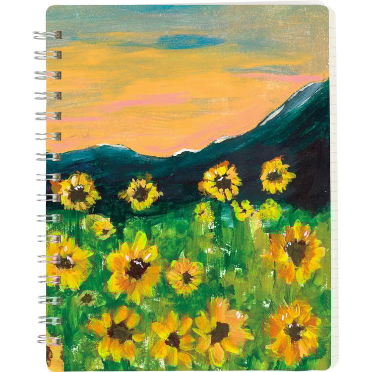 A double-sided spiral notebook from our Friendship Heart Gallery Collection displaying a hand painted design of a sunflower field replicated from original art created at the Friendship Heart Gallery in downtown Lancaster, PA by artists with intellectual disabilities and autism. Back cover features coordinating yellow design. Our Sunflower Field spiral notebook includes 120 lined pages. A charming and functional everyday accessory that is also great for gifting.