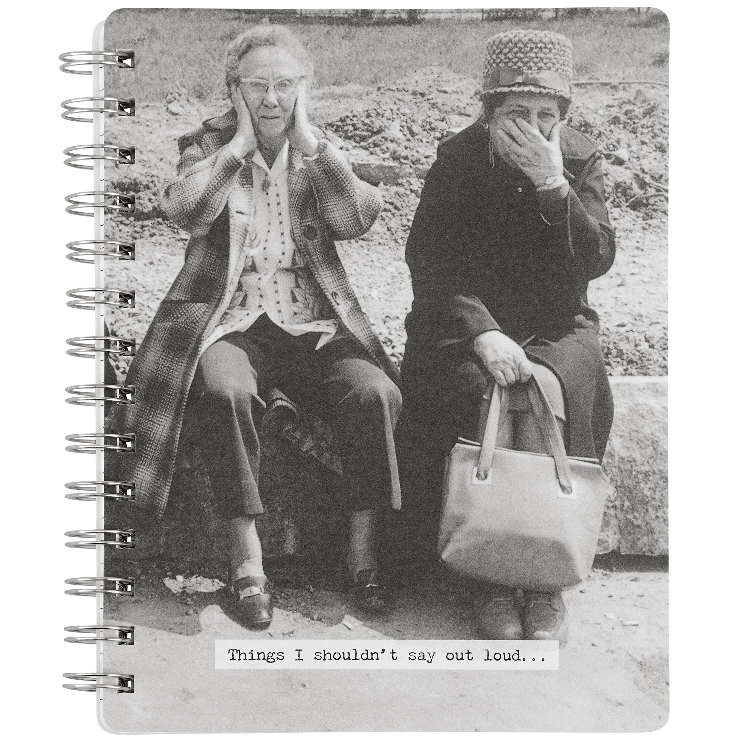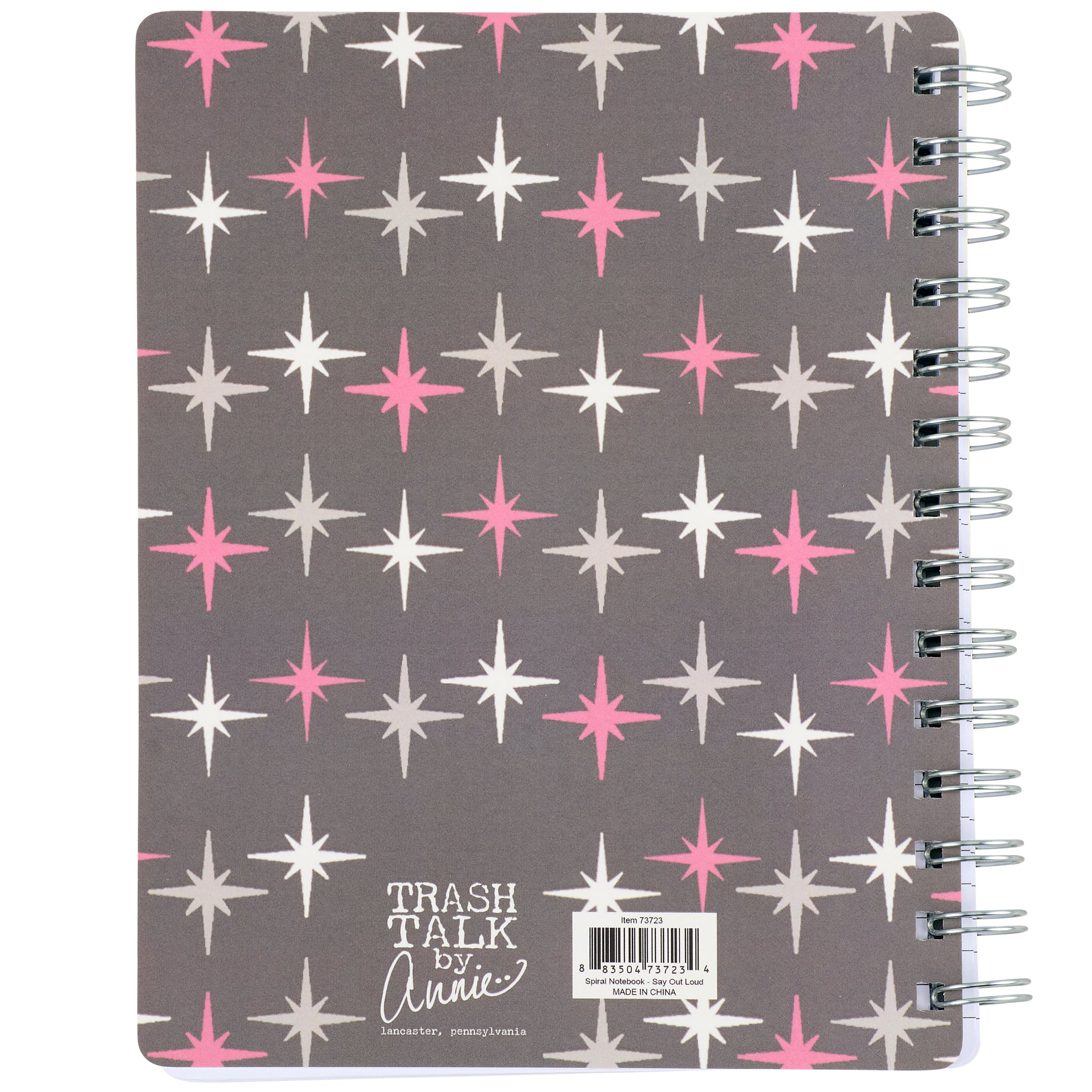 A double-sided spiral notebook from our Trash Talk By Annie Collection displaying a vintage black and white photo complemented by a sassy sentiment that reads "Things I Shouldn't Say Out Loud..." The back cover of the notebook features a classy pink and gray retro pattern to complete the look. Our Things I Shouldn't Say Out Loud spiral notebook includes 120 lined pages. A fun gift that calls back to a vintage style with modern sassy sentiments, perfect for making a statement while getting a giggle out of others.