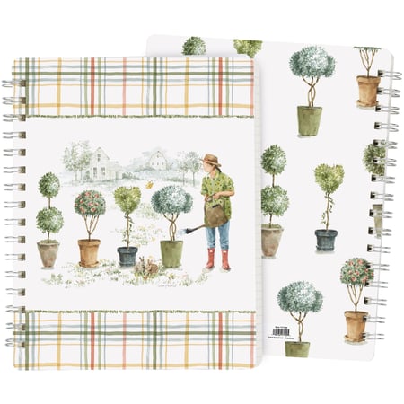 A double-sided spiral notebook from our Garden Collection displaying a design of a person tending to topiaries with charming scenery and garden inspired plaid pattern. Design is replicated from original art hand painted in a delicate watercolor style. Back cover features coordinating pattern made of topiary designs. Our Topiaries spiral notebook includes 120 lined pages. A functional garden-themed accessory that is also great for gifting.