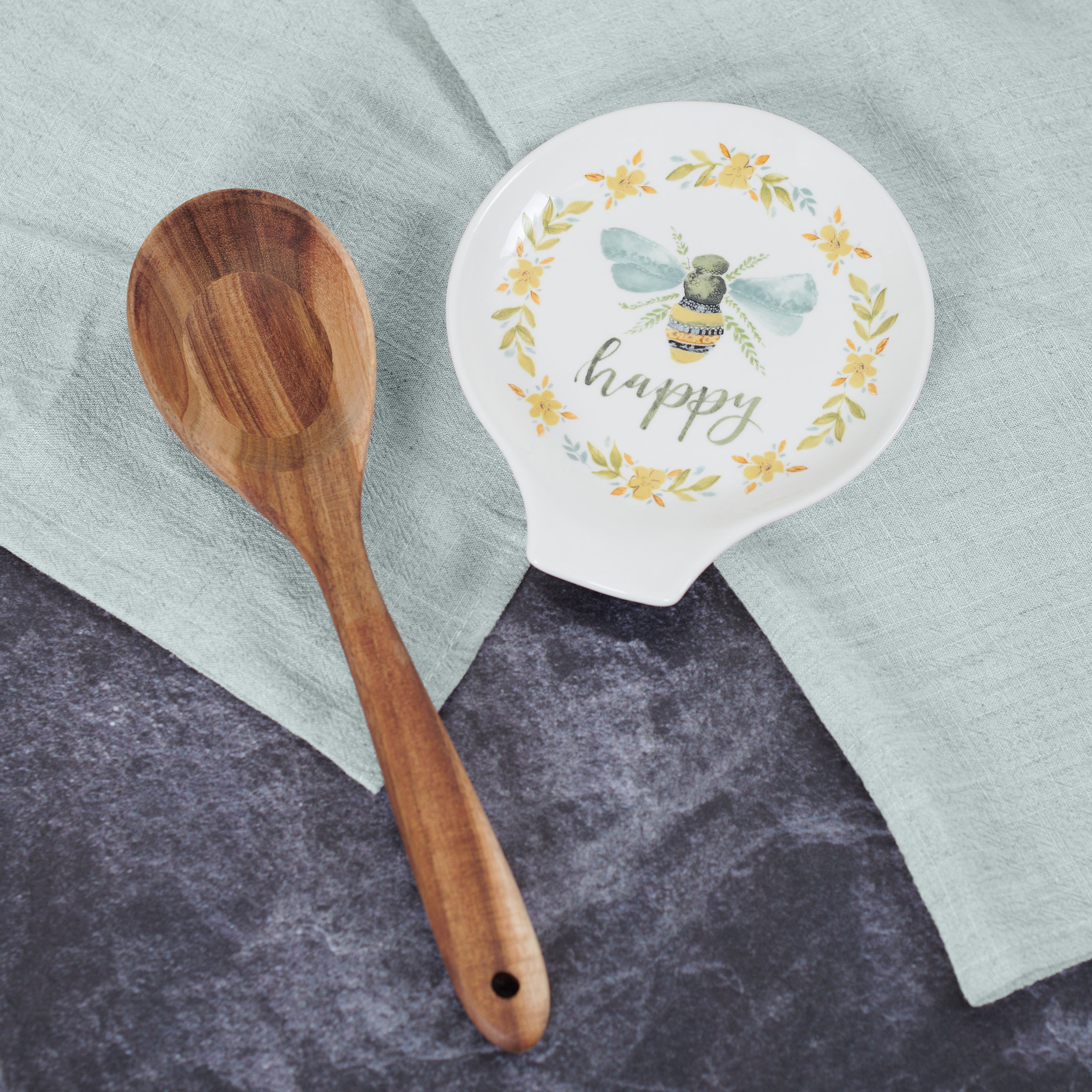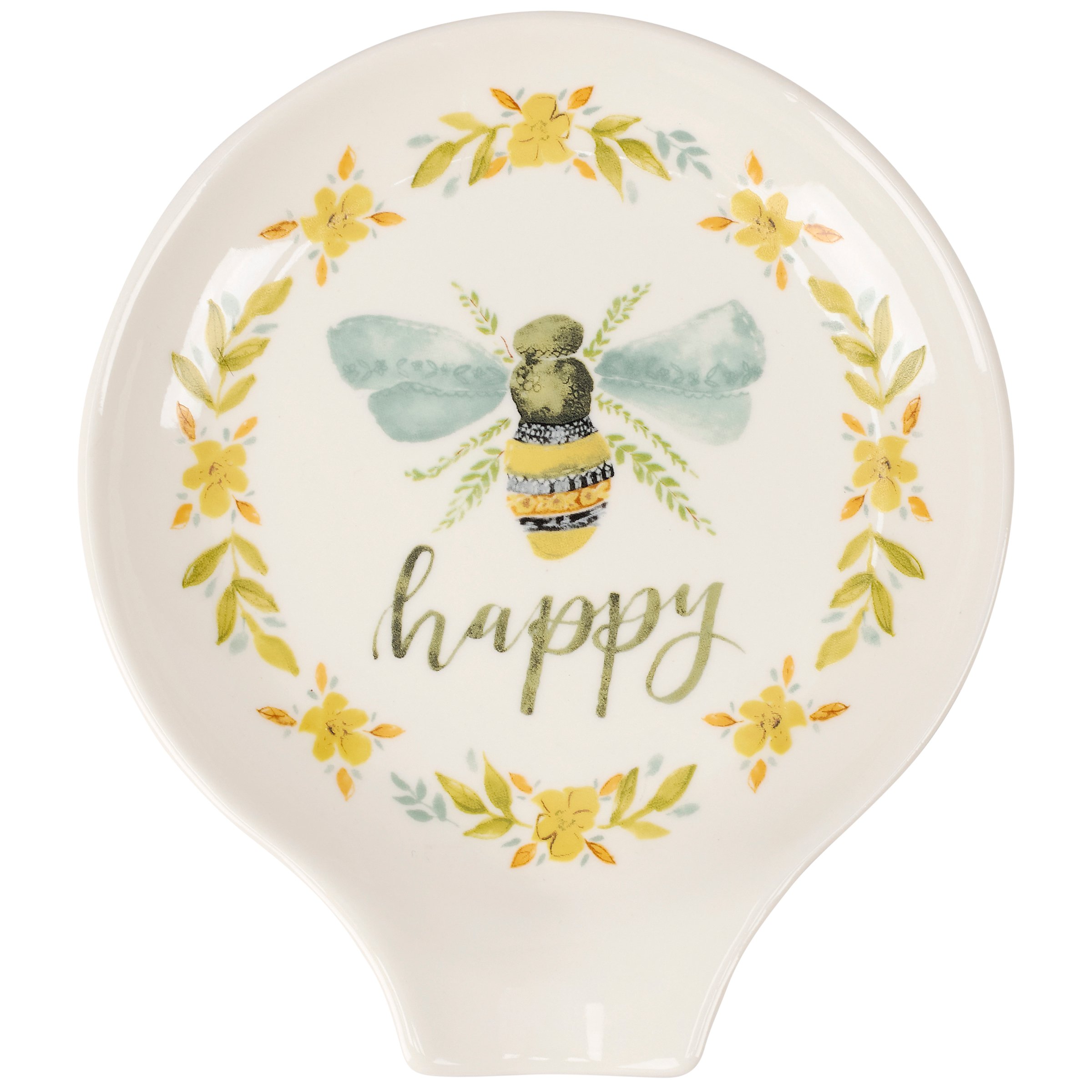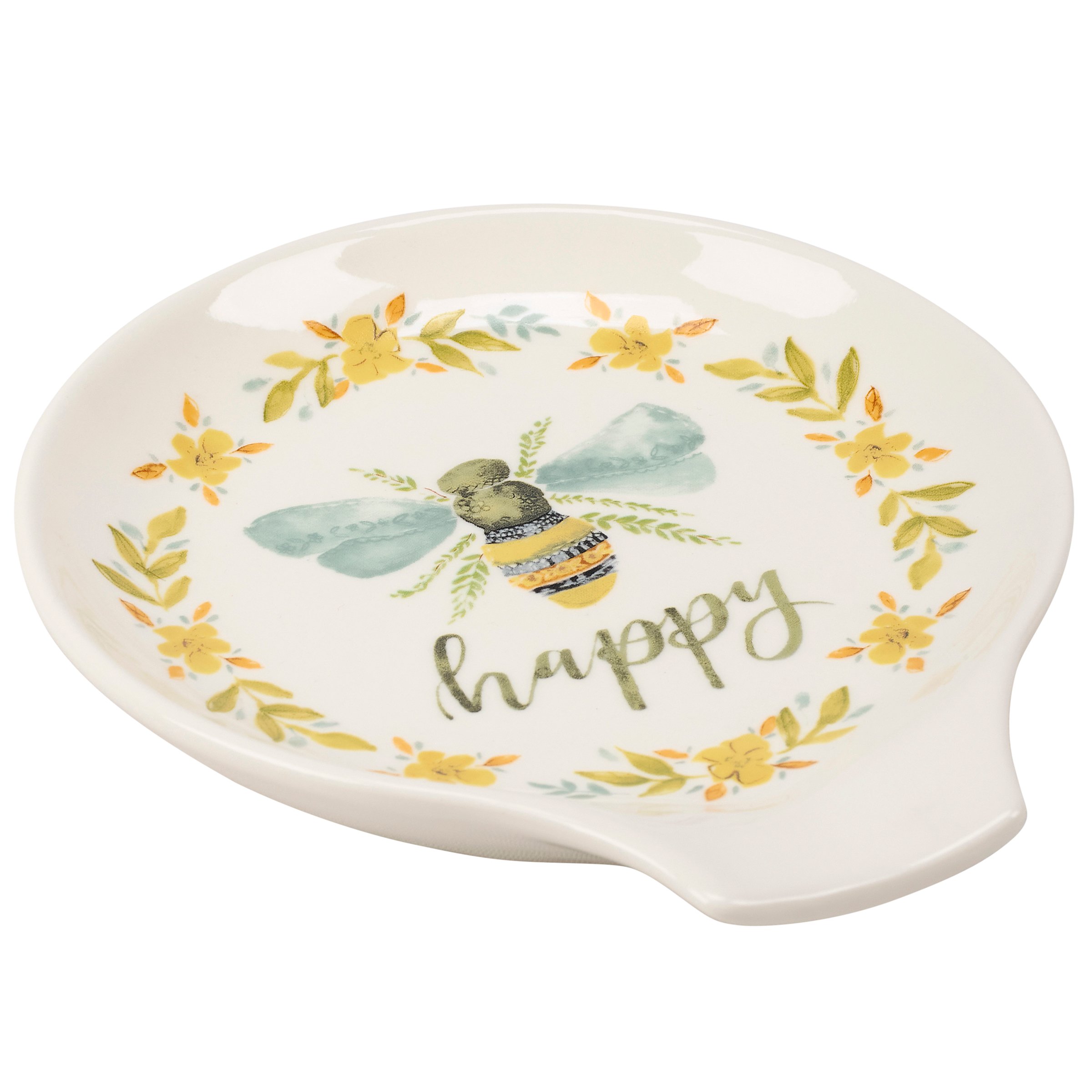 A stoneware spoon rest from our Garden Collection displaying bee and flowers around an inspirational sentiment that reads "Happy." Bee-themed design is replicated from original art hand painted in a unique watercolor style. Our Bee Happy spoon rest is conveniently microwave, dishwasher, and food safe for easy use. An inspirational bee-themed kitchen accessory perfect for everyday display.