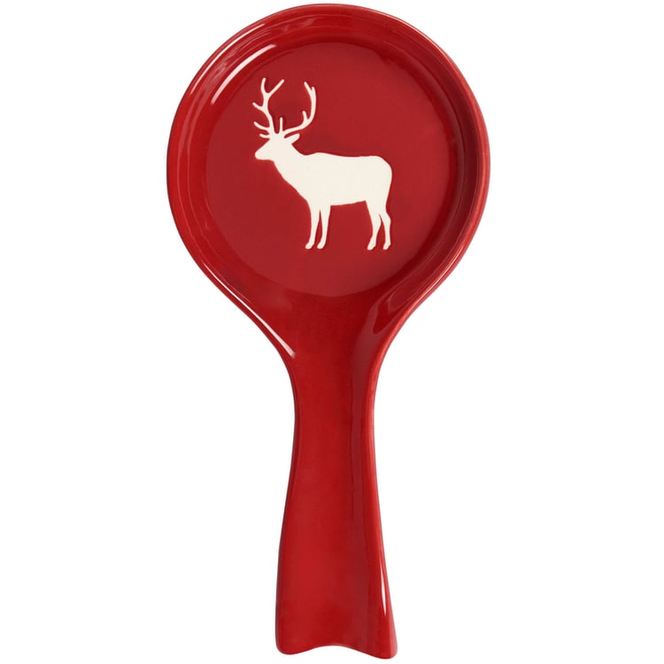 A red stoneware spoon rest featuring a deer design. Microwave, dishwasher, and food safe.