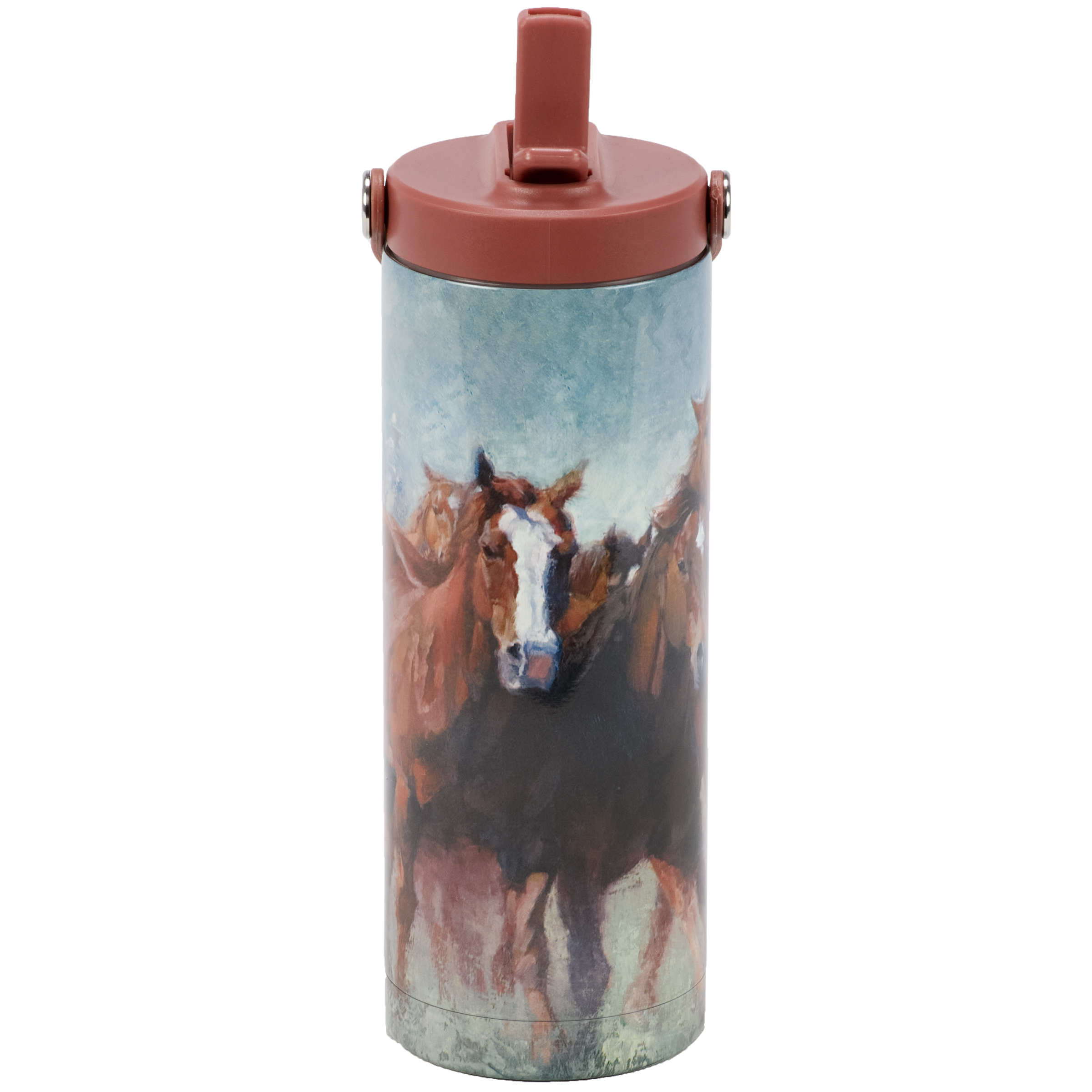A 20 oz stainless steel water bottle from our Western Collection displaying a hand painted scene of running horses. Our Running Horses sport bottle is insulated to keep beverages cold for 12 hours and hot for 6 hours. Insulated water bottle includes an easy to open lid with built-in straw and strap making it easy to carry. Hand-wash only. A western-themed accessory perfect for on-the-go.