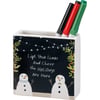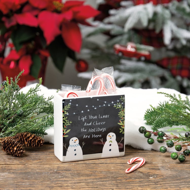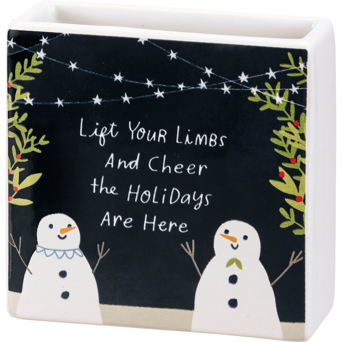 A double-sided square stoneware vase featuring snowmen, greenery, and star-shaped string light designs with "Lift Your Limbs And Cheer The Holidays Are Here" sentiment. Sides feature coordinating white design. Our Lift Your Limbs square vase is perfect for displaying florals and other items. This house plant home decor makes a great addition to any space.