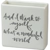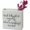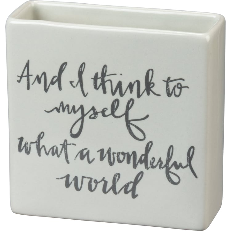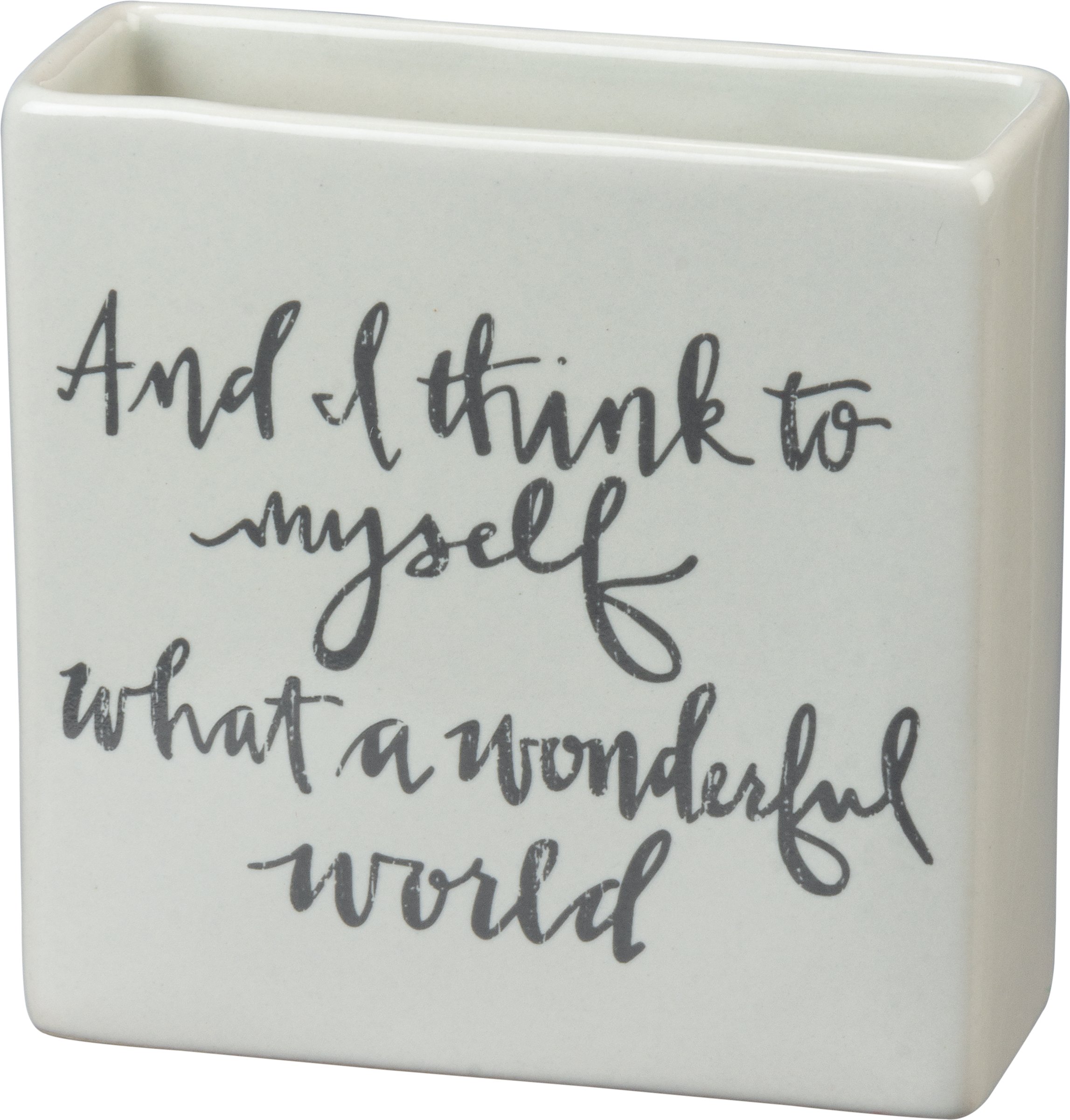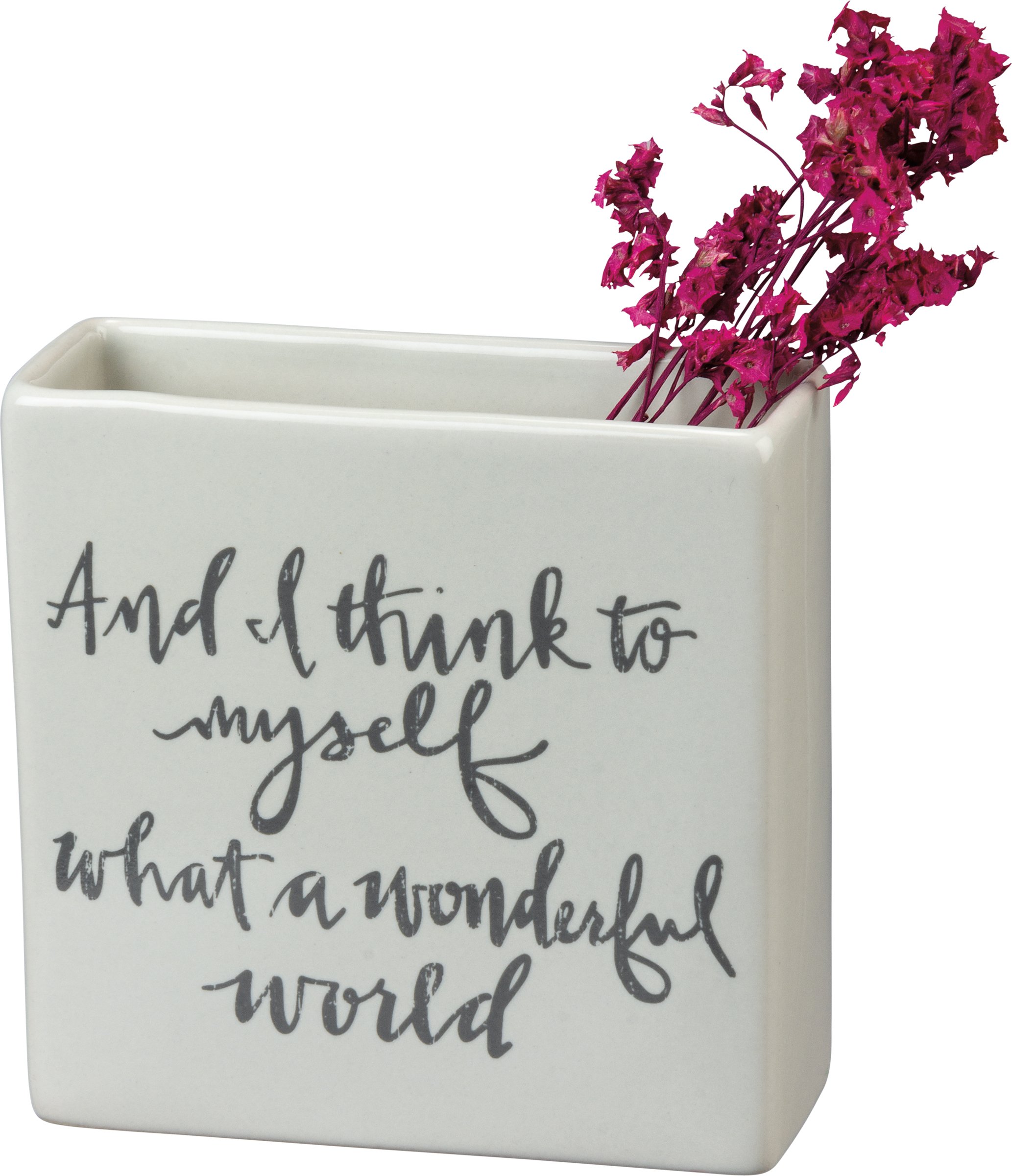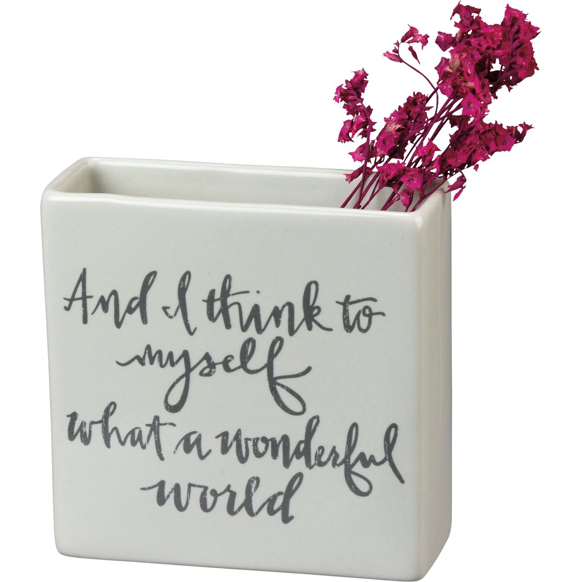A stoneware vase featuring a distressed "And I Think To Myself What A Wonderful World" hand lettered sentiment in a neutral palette that complements well with existing decor.