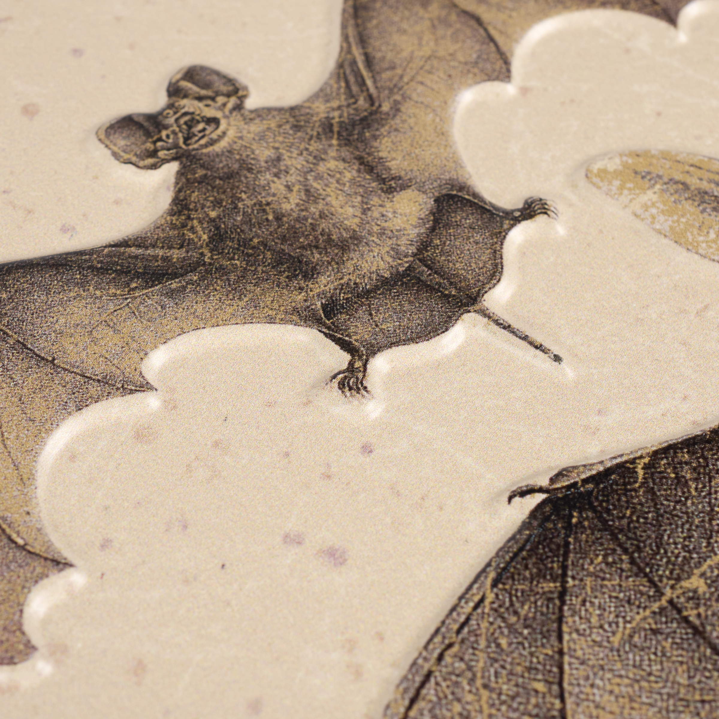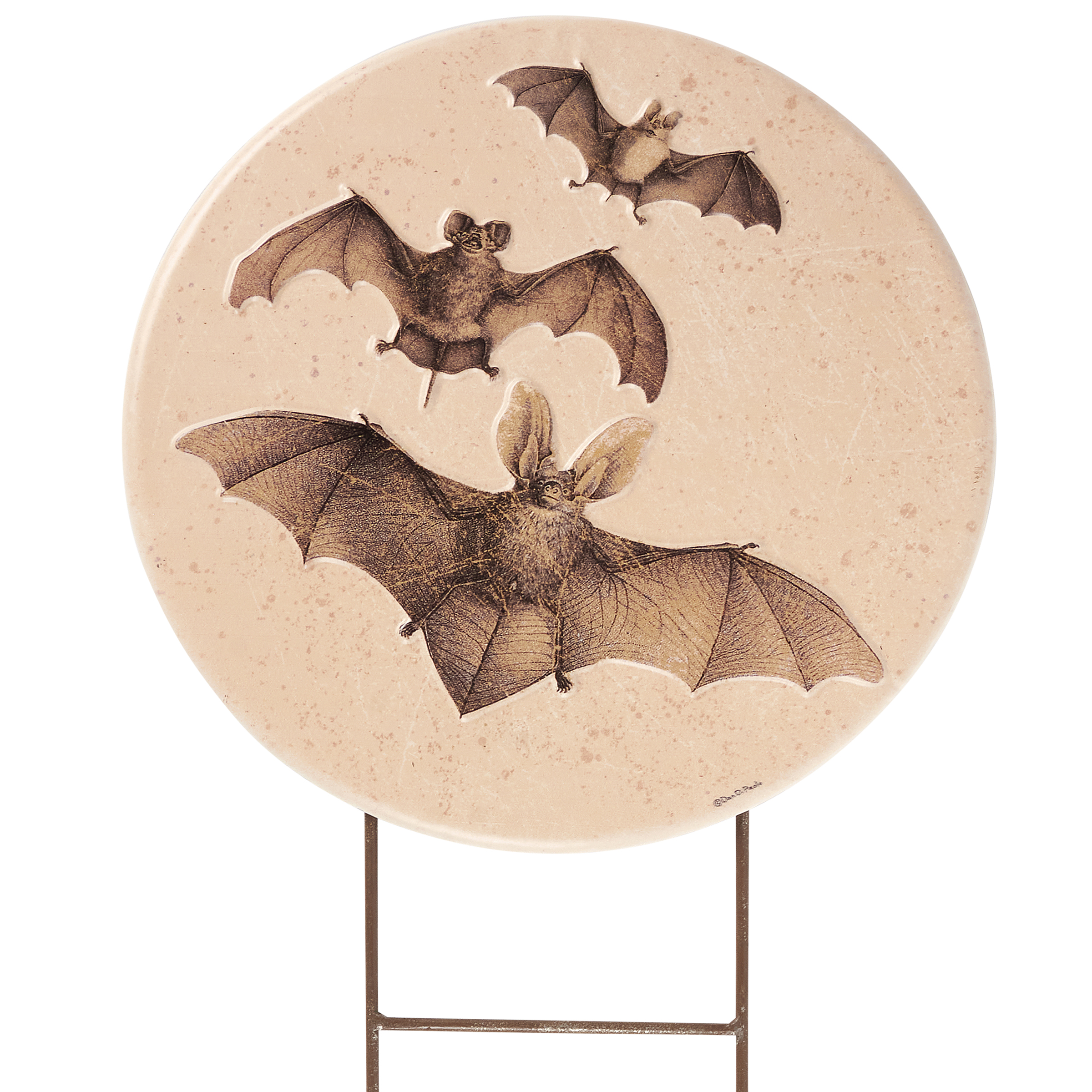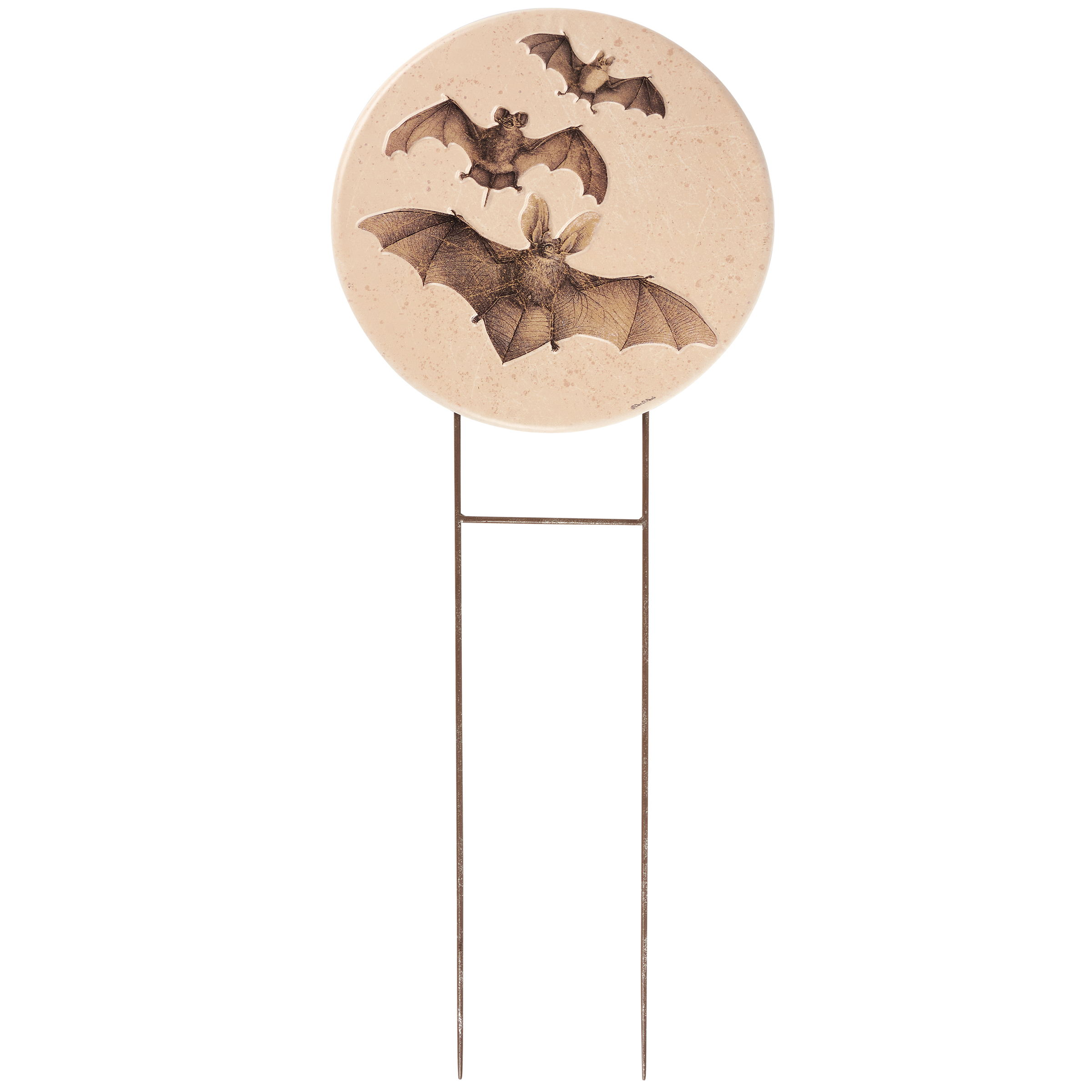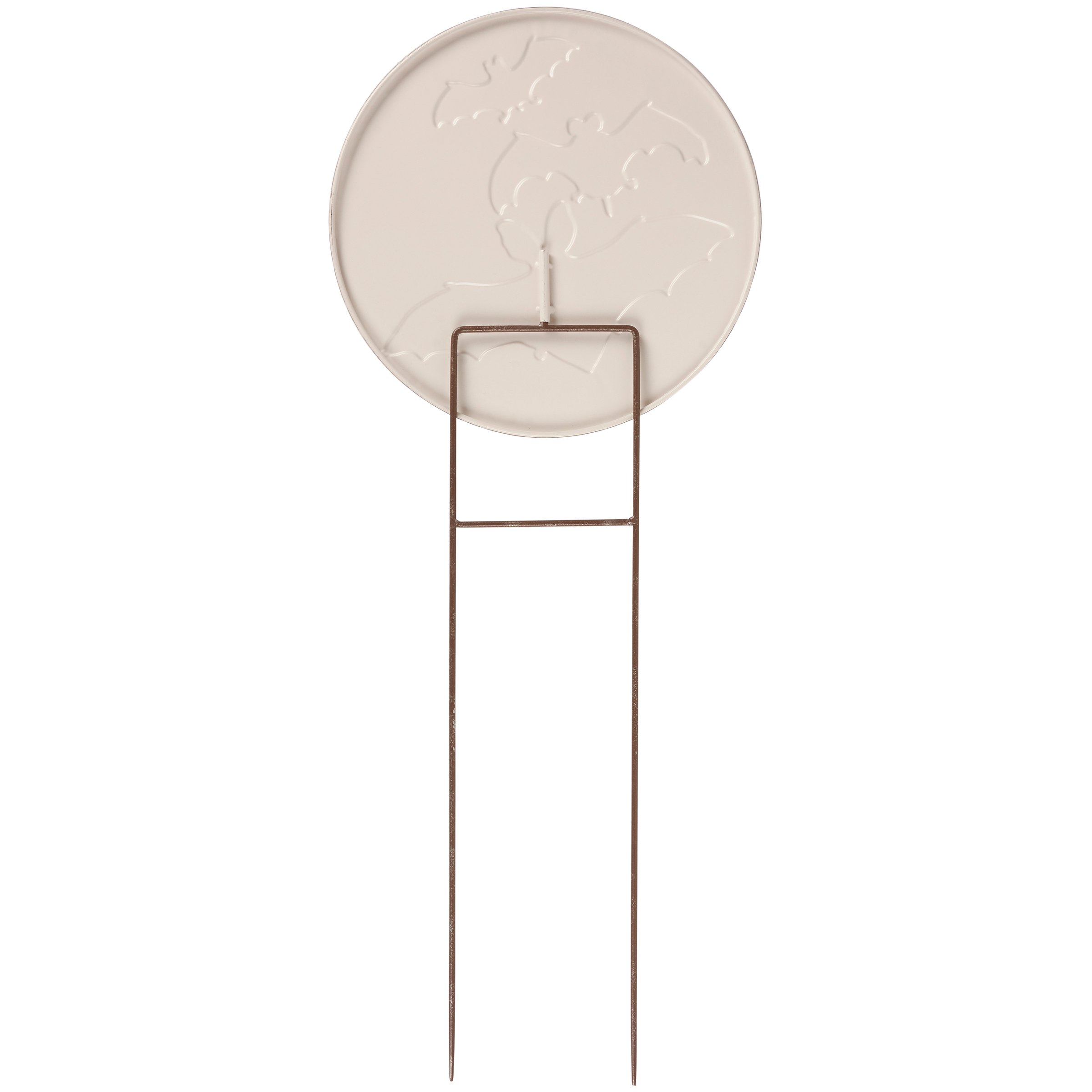 A metal stake from our Halloween Collection displaying vintage art of flying bats with embossed details for added dimension and attached to a tall metal stake. Our Bats stake stands 18 inches tall to easily stand out in a garden or yard. A vintage Halloween outdoor accent perfect for seasonal display.