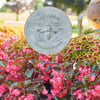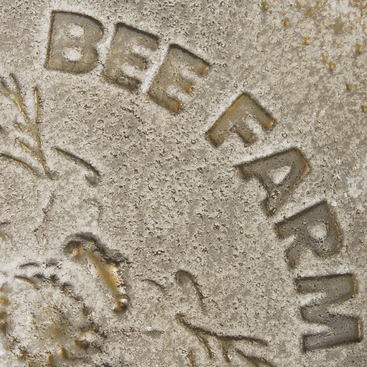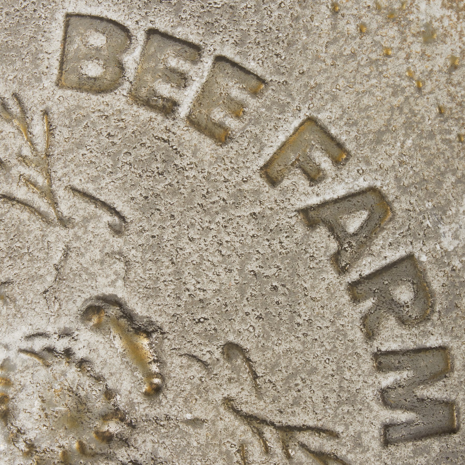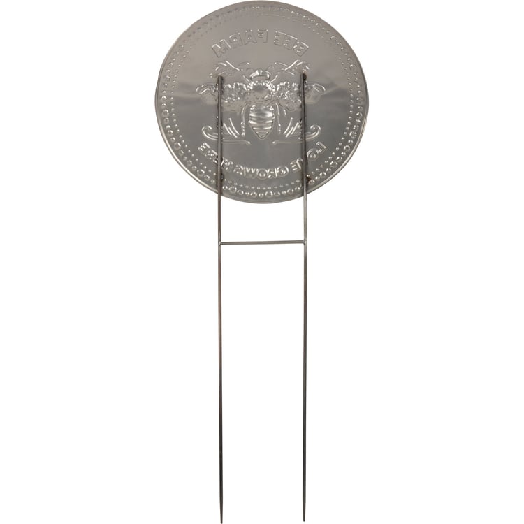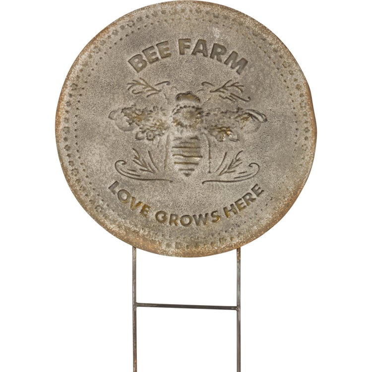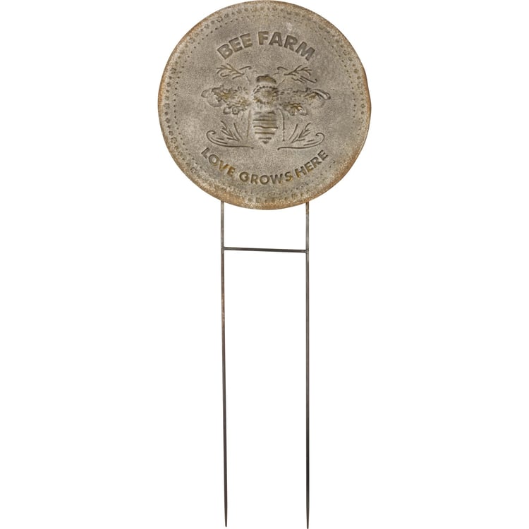 A metal stake from our Bee Collection displaying an embossed bee design and sentiment that reads "Bee Farm - Love Grows Here." Our Bee Farm Love Grows Here stake is a perfect addition to any garden. Assembly required.