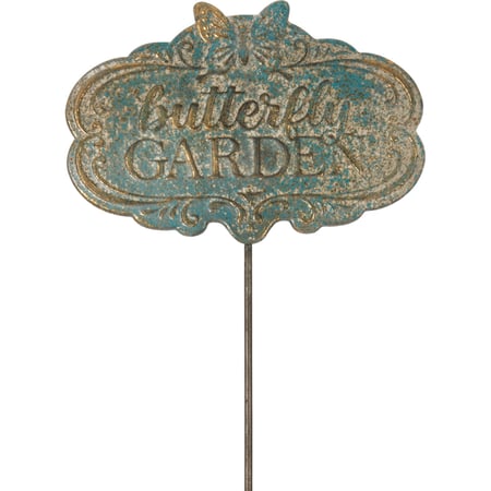 A metal stake from our Garden Collection displaying an embossed butterfly design with aged details and sentiment that reads "Butterfly Garden." Our Butterfly Garden stake is a perfect addition to any garden.