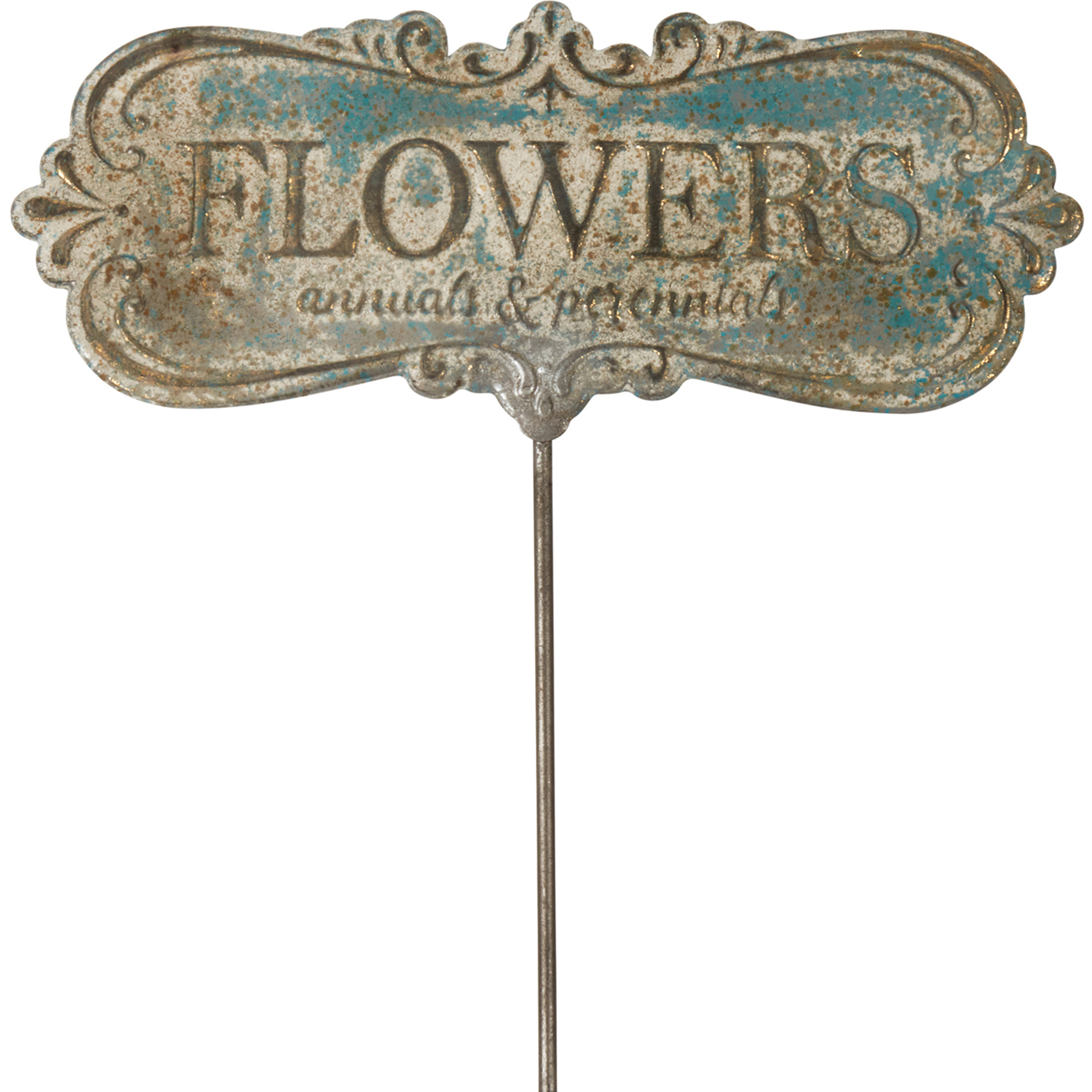 A metal stake from our Garden Collection displaying an embossed design with aged details and sentiment that reads "Flowers - Annuals & Perennials." Our Flowers Annuals & Perennials stake is a perfect addition to any garden.