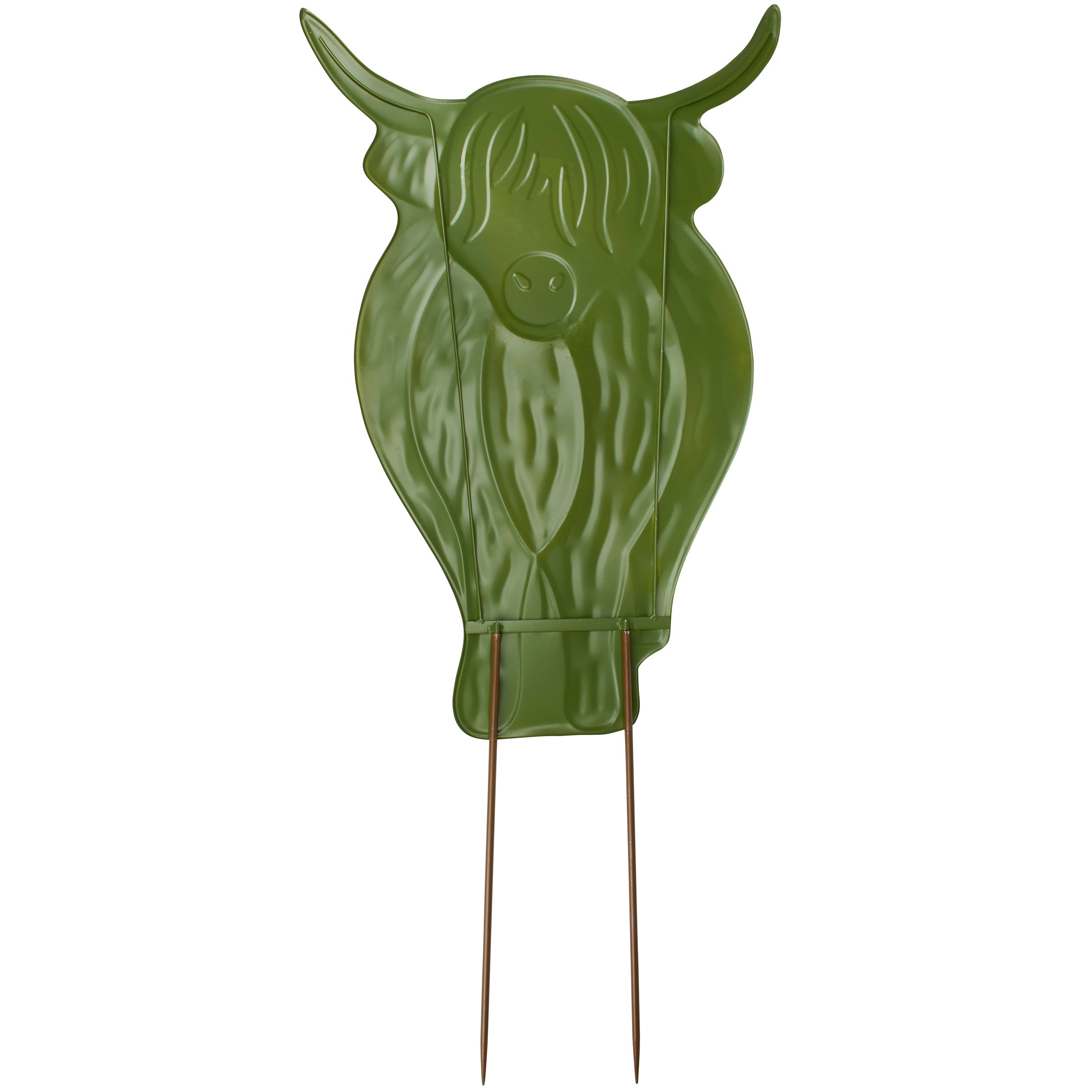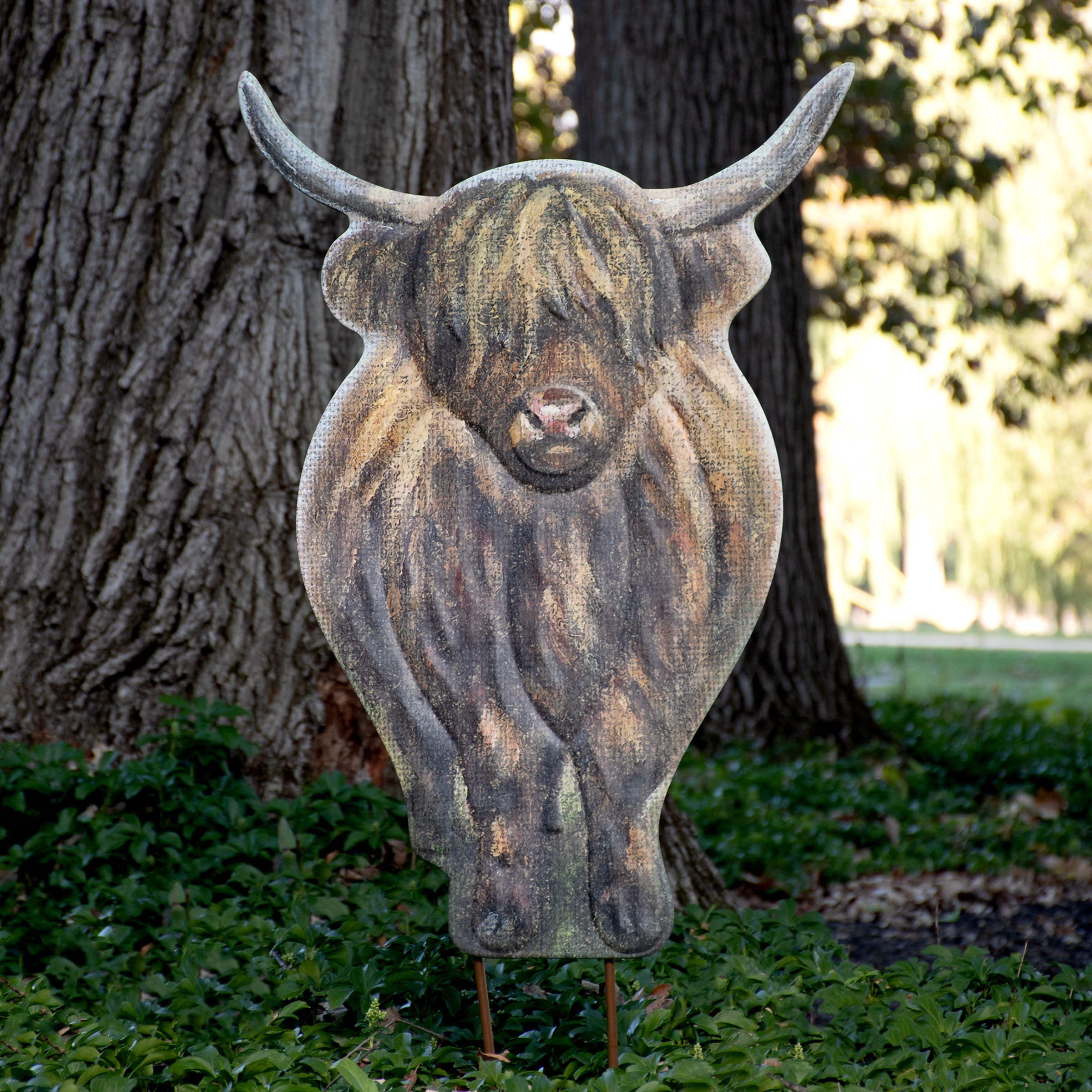 A decorative metal pick from our Farmhouse Collection featuring a metal cutout piece in the shape of the displayed highland cow art that is attached to metal stakes. Highland cow design is replicated from original artwork painted onto burlap canvas, giving the art a unique depth and texture with embossed details for added dimension. Our Highland Cow garden pick includes 16 inch tall picks to easily stand out in a garden or yard. Assembly required before displaying. A charming farm themed garden accent perfect for adding character to any outdoor display.