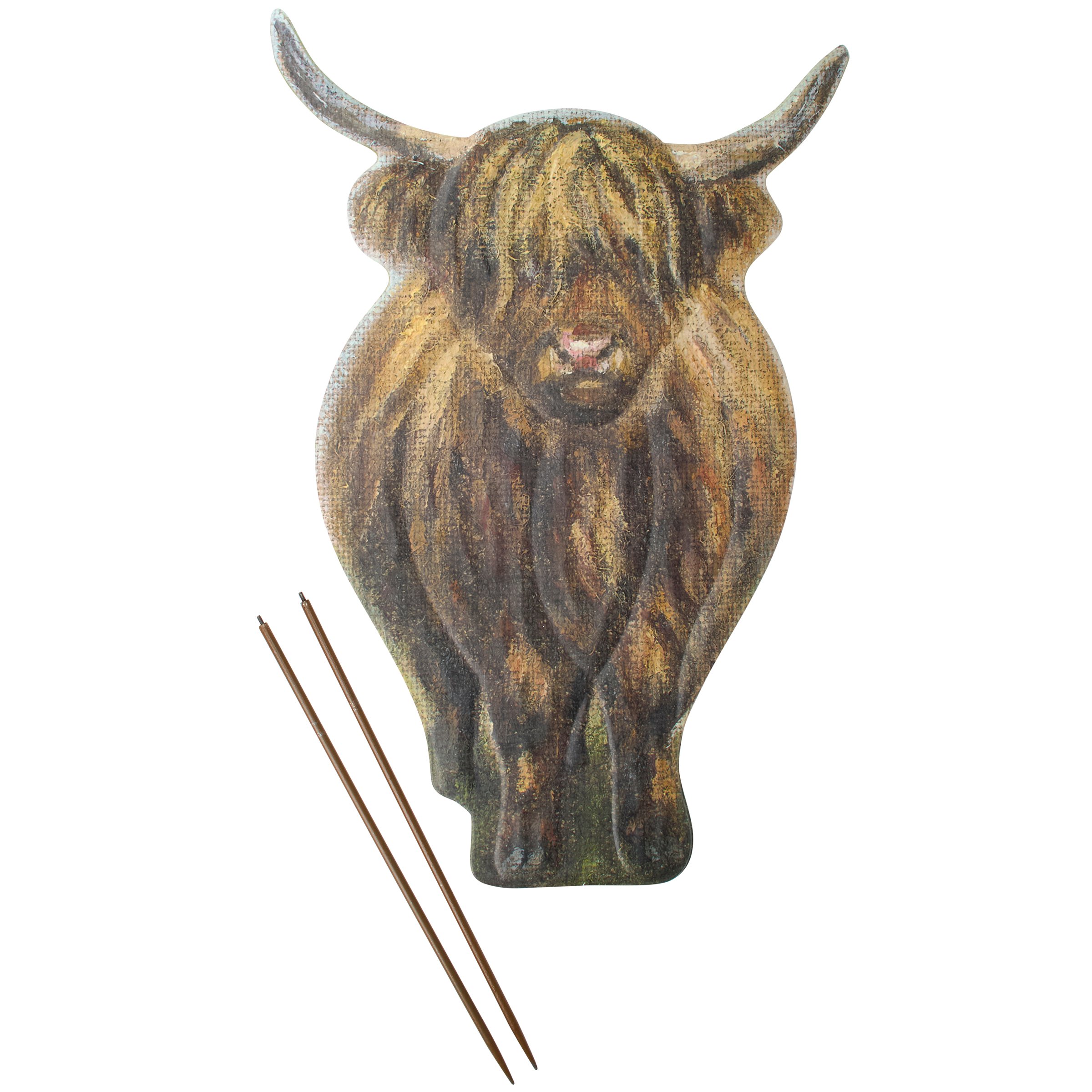 A decorative metal pick from our Farmhouse Collection featuring a metal cutout piece in the shape of the displayed highland cow art that is attached to metal stakes. Highland cow design is replicated from original artwork painted onto burlap canvas, giving the art a unique depth and texture with embossed details for added dimension. Our Highland Cow garden pick includes 16 inch tall picks to easily stand out in a garden or yard. Assembly required before displaying. A charming farm themed garden accent perfect for adding character to any outdoor display.