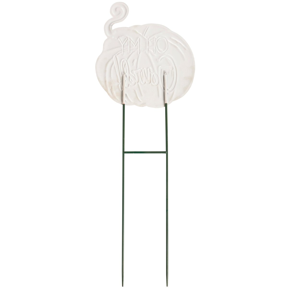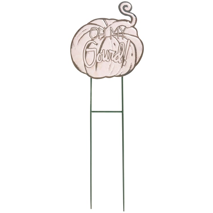 A metal stake from our Fall & Harvest Collection displaying an embossed gourd design and fun seasonal sentiment that reads "Oh My Gourd!" Design is attached to a tall metal stake. Our Oh My Gourd stake stands 24.5 inches tall to easily stand out in a garden or yard. A fun fall-themed outdoor accent perfect for seasonal display.