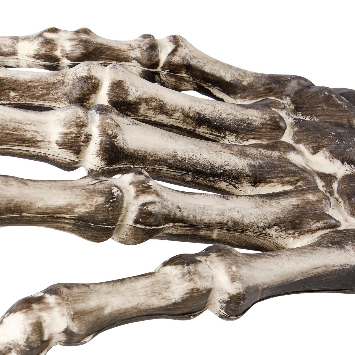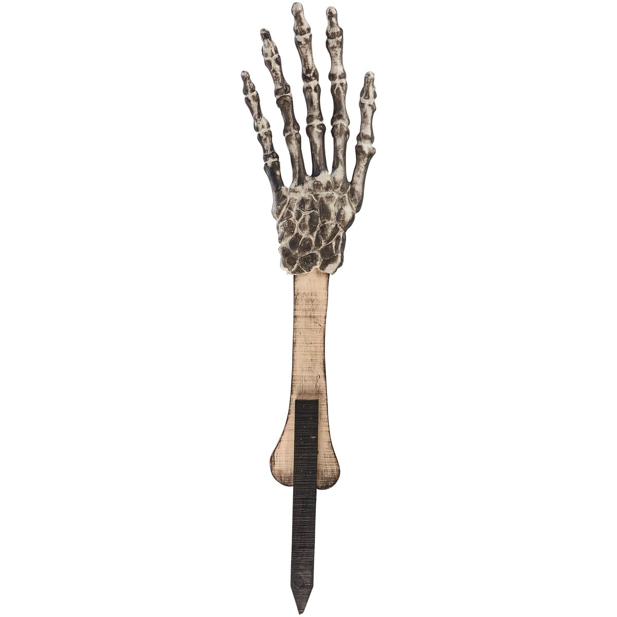 A decorative stake from our Halloween Collection displaying a skeleton hand design made using natural wood with painted accents and distressed details attached to a black wooden stake. Our Skeleton Hand stake includes a 8 inch long stake to easily stand out in display. A rustic accent perfect for seasonal display.