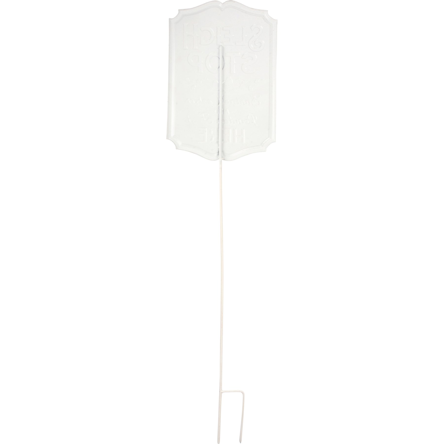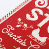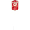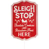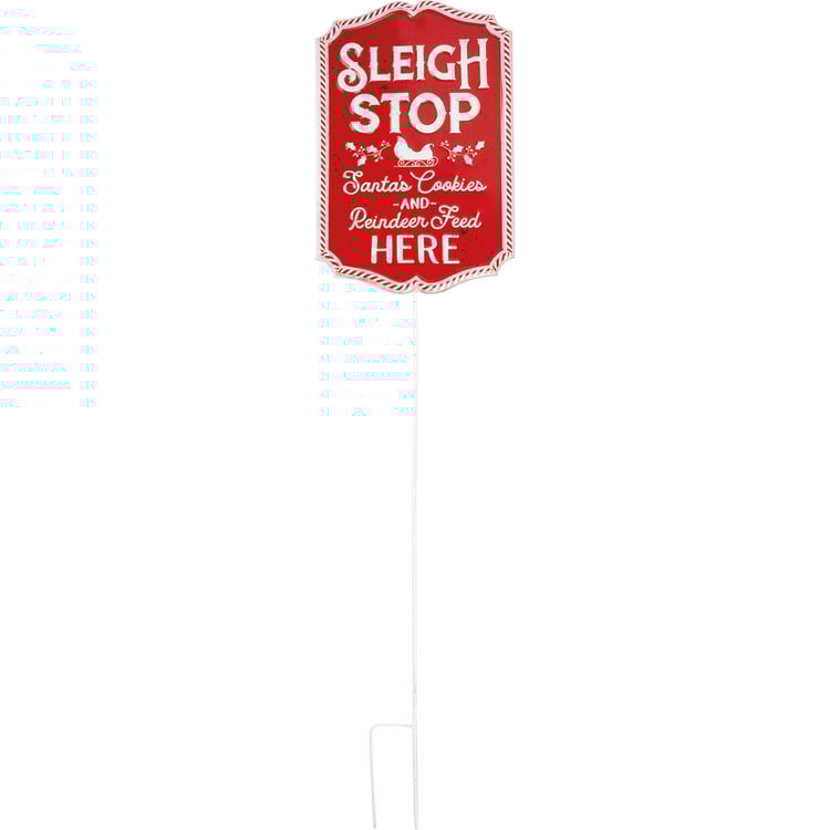 A metal stake featuring a red sign with embossed "Sleigh Stop Santa's Cookies And Reindeer Feed Here" sentiment with Santa's sleigh design. Our Sleigh Stop stake is a perfect holiday addition to any garden.