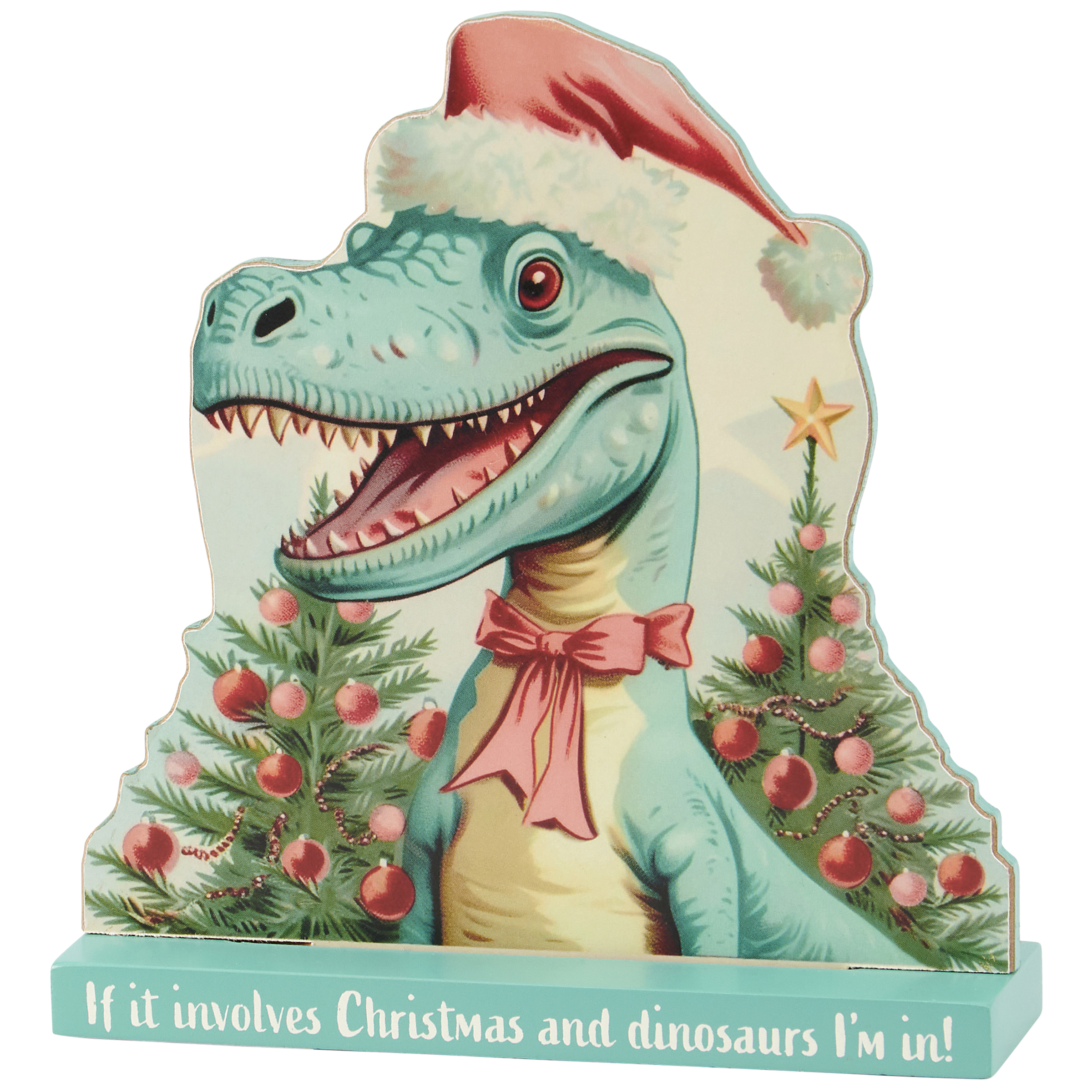 A wooden stand up décor piece from our Christmas Collection displaying a cutout design of a t-rex celebrating Christmas in a fun retro pastel style. Christmas dinosaur design is double-sided to easily view art on either side and is attached to a pastel blue base displaying a fun dinosaur inspired holiday sentiment that reads "If It Involves Christmas And Dinosaurs I'm In!" Our Dino Christmas stand up is designed to free-stand on a flat surface for easy display. A retro dinosaur-themed Christmas home accent that can be easily displayed in any home or work space.