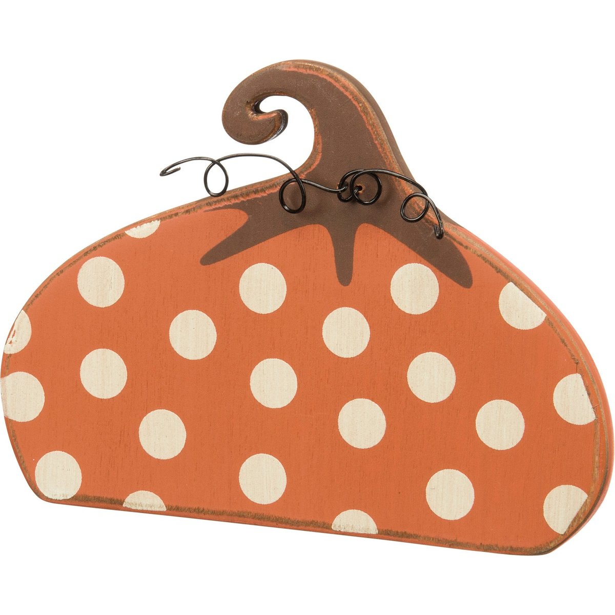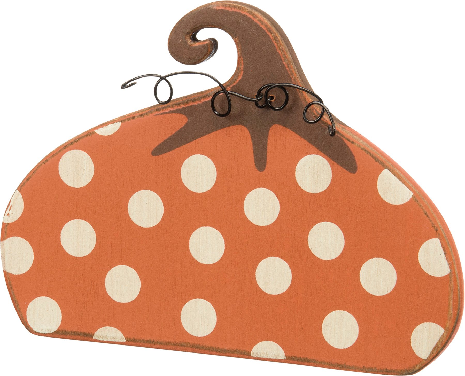A wooden pumpkin-shaped chunky sitter featuring polka dot designs and spiral wire detail. Complements well with coordinating designs for a festive collection!