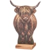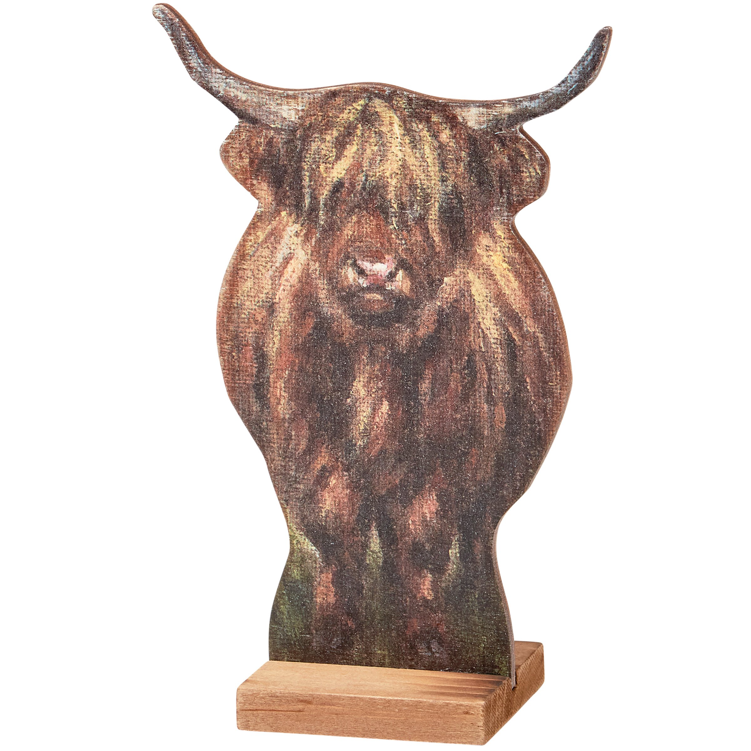 A wooden stand up décor piece from our Farmhouse Collection displaying a cutout design of a highland cow replicated from original artwork painted onto burlap canvas, giving the art a unique depth and texture. Design is double-sided to easily view art on either side and is attached to a natural wood base. Our Highland Cow stand up can free-stand on any flat surface. A rustic everyday home accent that can be easily displayed in any home or work space.