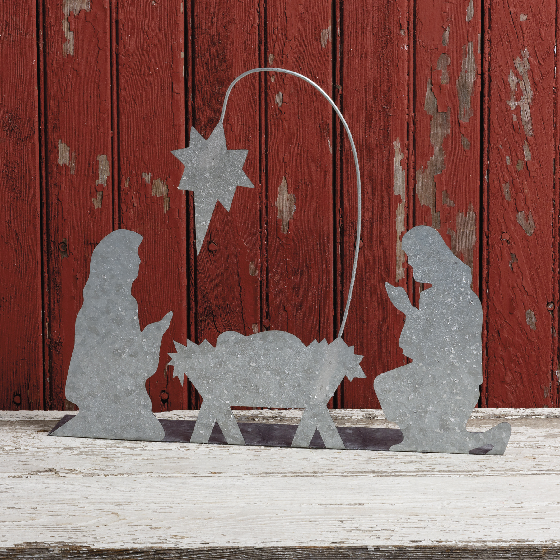 A Christmas staple, a galvanized metal nativity scene with hanging star accent and sturdy base.