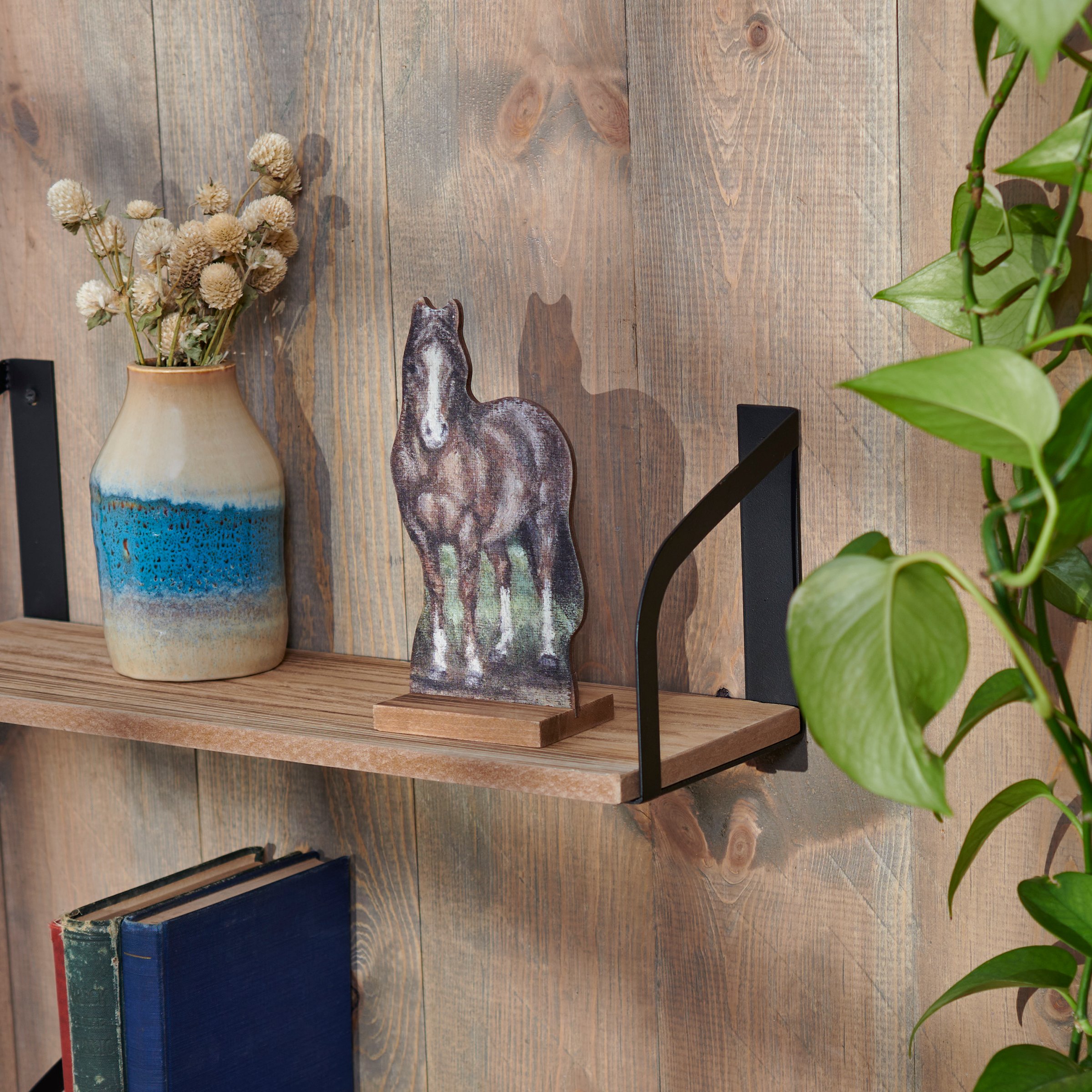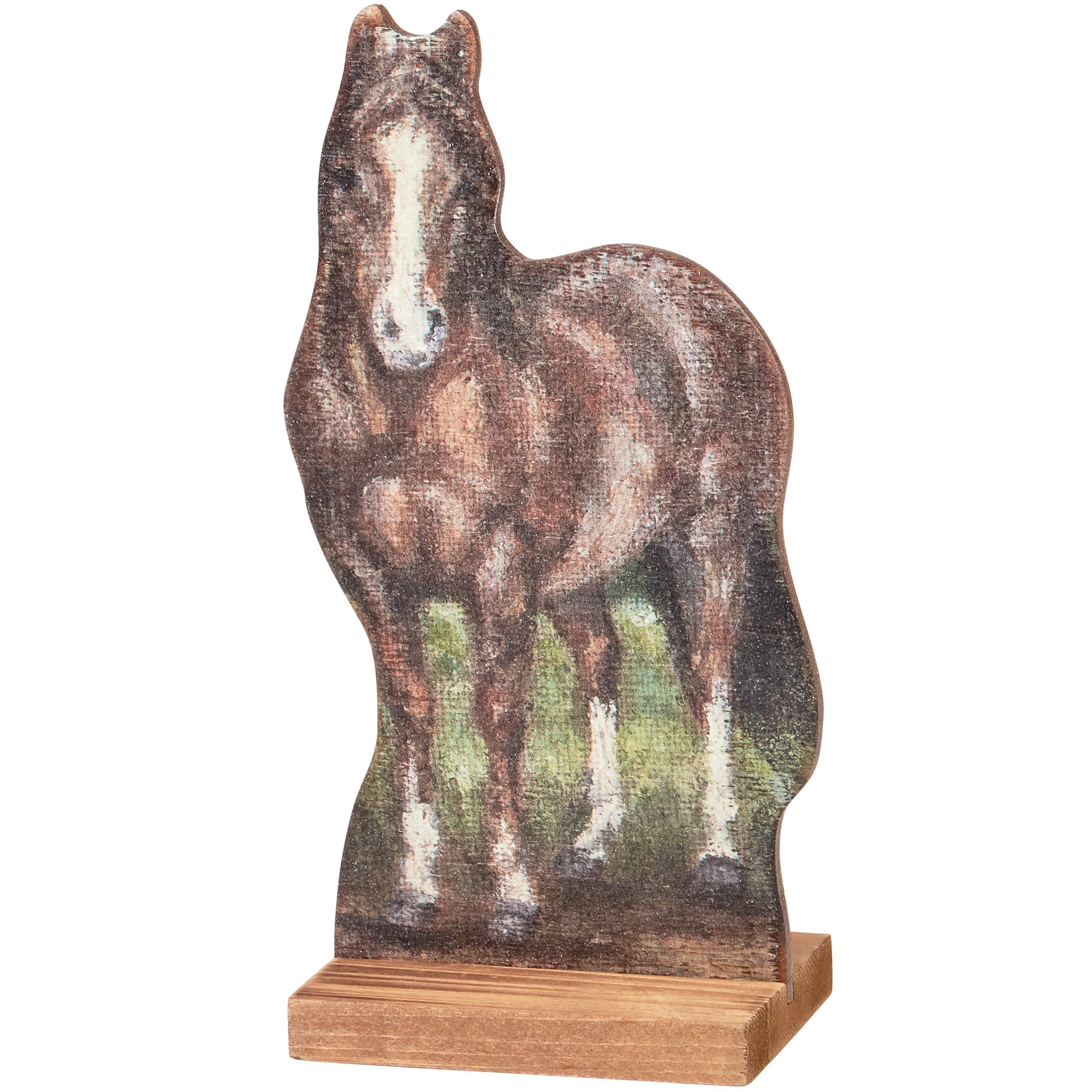 A wooden stand up décor piece from our Farmhouse Collection displaying a cutout design of a brown horse replicated from original artwork painted onto burlap canvas, giving the art a unique depth and texture. Design is double-sided to easily view art on either side and is attached to a natural wood base. Our Horse stand up can free-stand on any flat surface. A rustic everyday home accent that can be easily displayed in any home or work space.