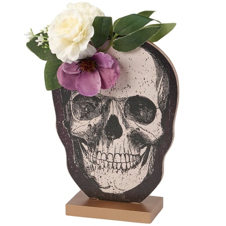 A wooden stand up décor piece from our Halloween Collection displaying a cutout design of a skull with moody faux florals attached to the top. Seasonal stand up is double-sided to easily view art on either side and is attached to a natural wood base. Our Moody Floral Skull stand up is designed to free-stand on any flat surface. A charming Halloween home accent that can be easily displayed in any home or work space.