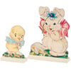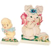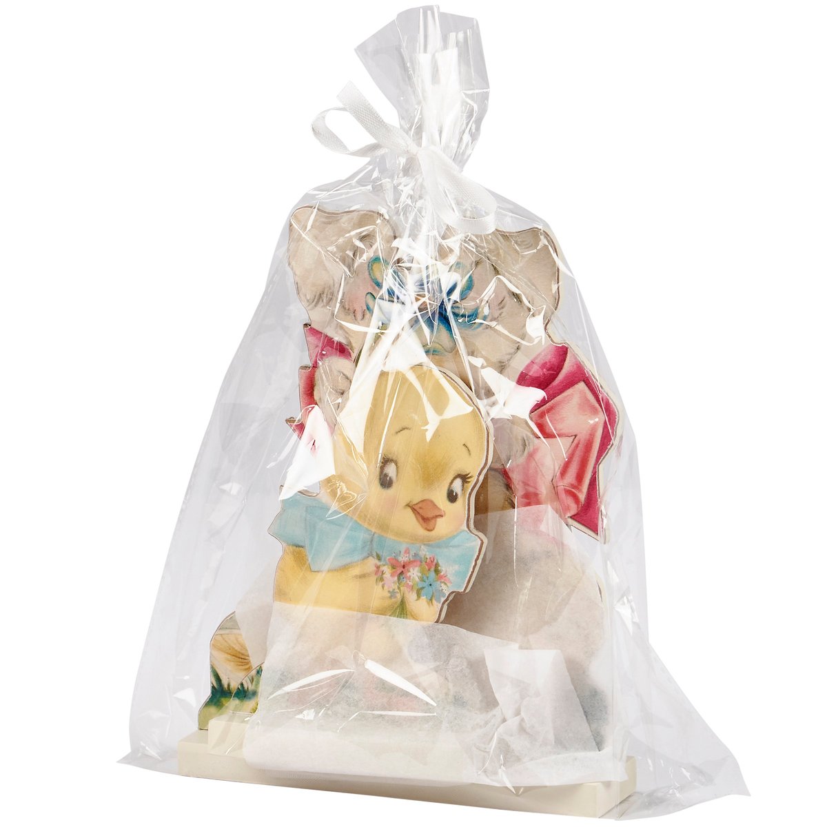 A set of 2 wooden stand ups from our Easter & Spring Collection displaying individual cutout designs of a bunny and a chick in a fun vintage art style. Seasonal stand up set is double-sided to easily view art on either side and attached to cream color wood bases. Our Bunny & Chick stand up set can free-stand on any flat surface using attached wooden bases. Seasonal set is packaged together in a poly bag and tied with white ribbon. A fun set of seasonal home accents with a variety of display options.
