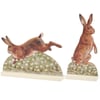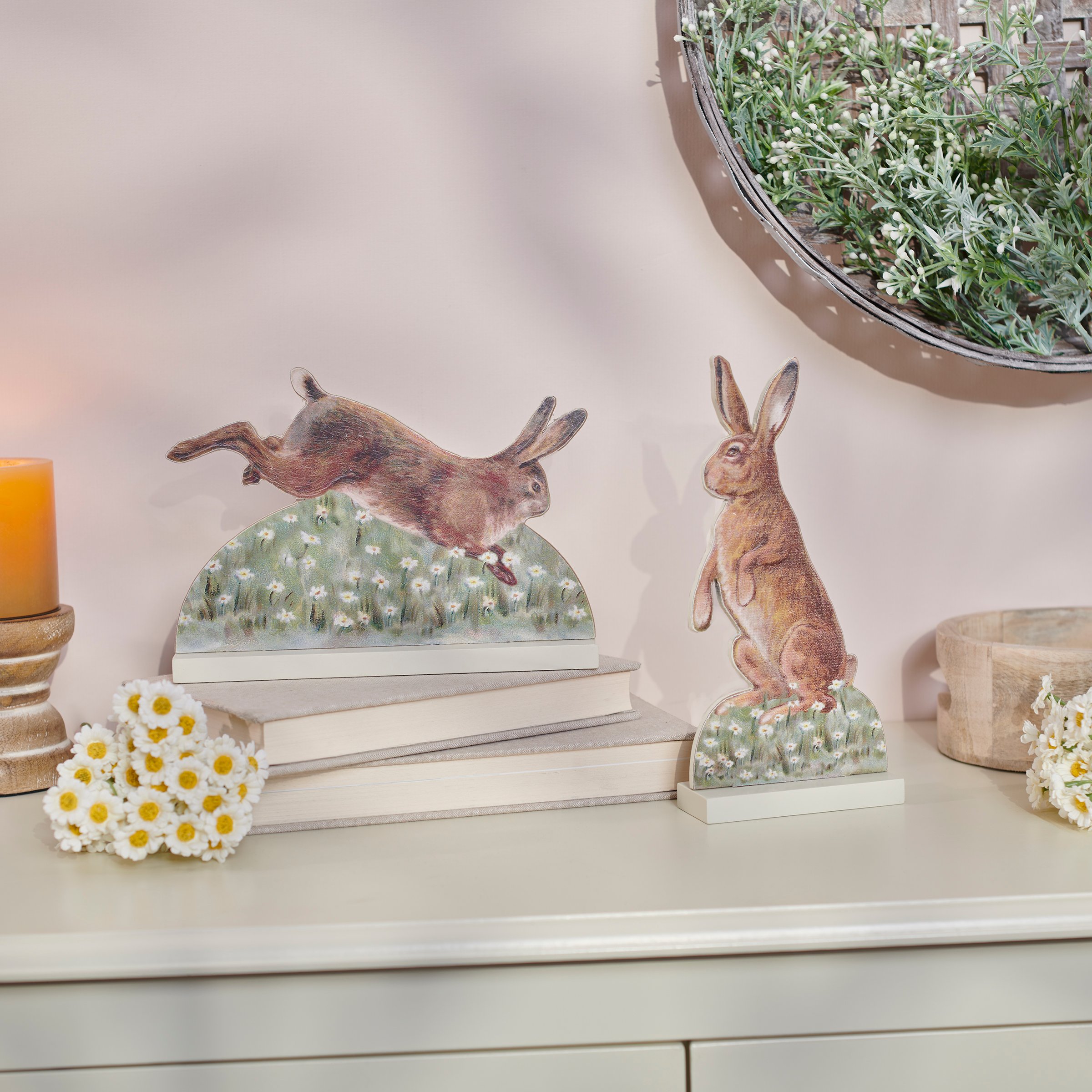 A set of 2 wooden stand ups from our Easter & Spring Collection displaying individual cutout designs of bunnies in a vintage art style. Seasonal stand up set is double-sided to easily view art on either side and attached to cream color wood bases. Our Bunny stand up set can free-stand on any flat surface using attached wooden bases. Seasonal set is packaged together in a poly bag and tied with white ribbon. A vintage set of seasonal home accents with a variety of display options.