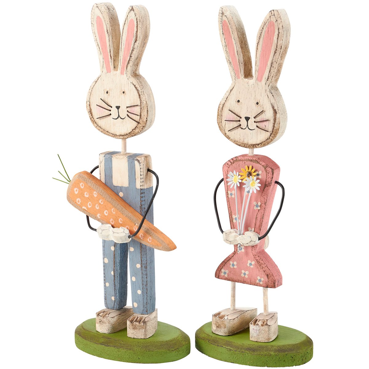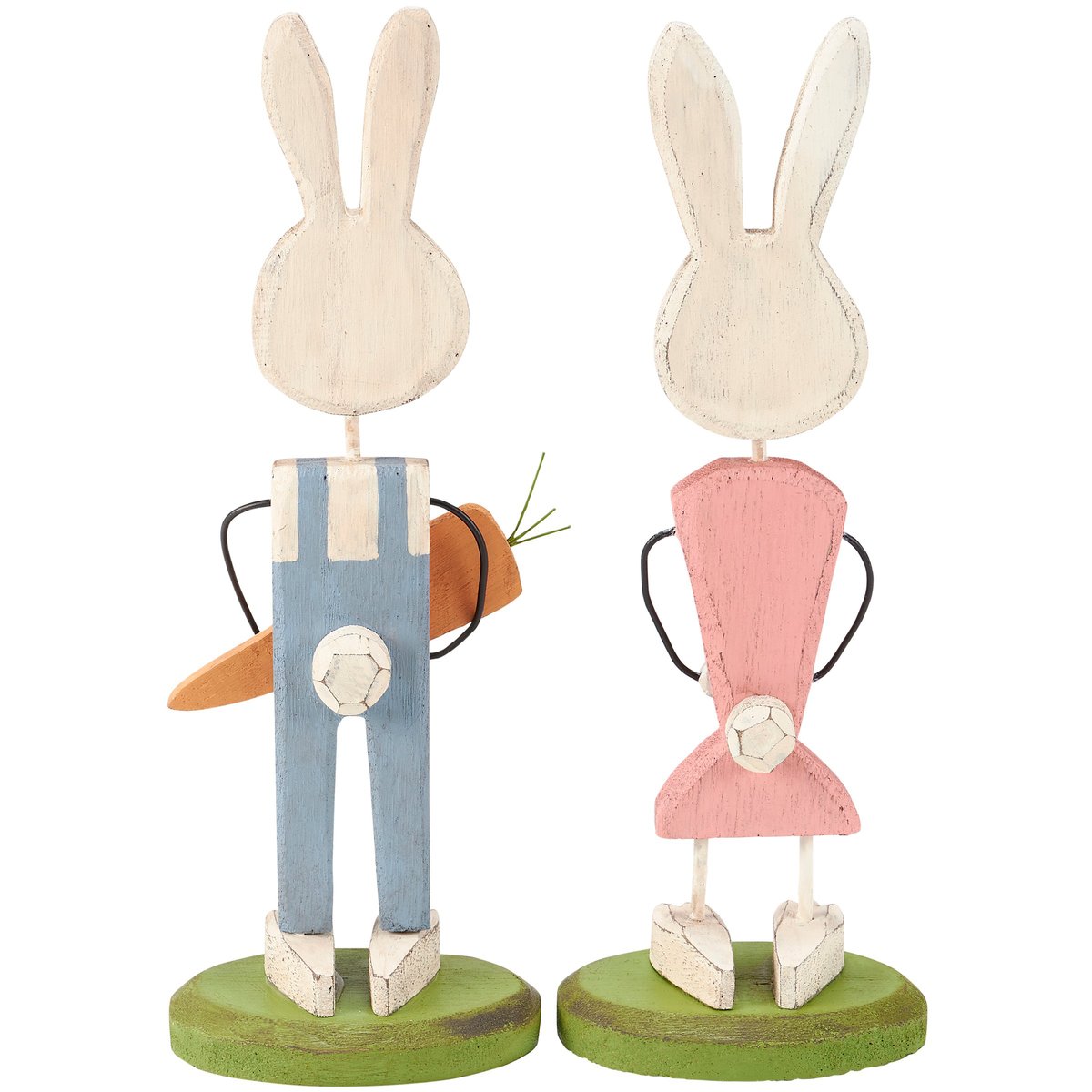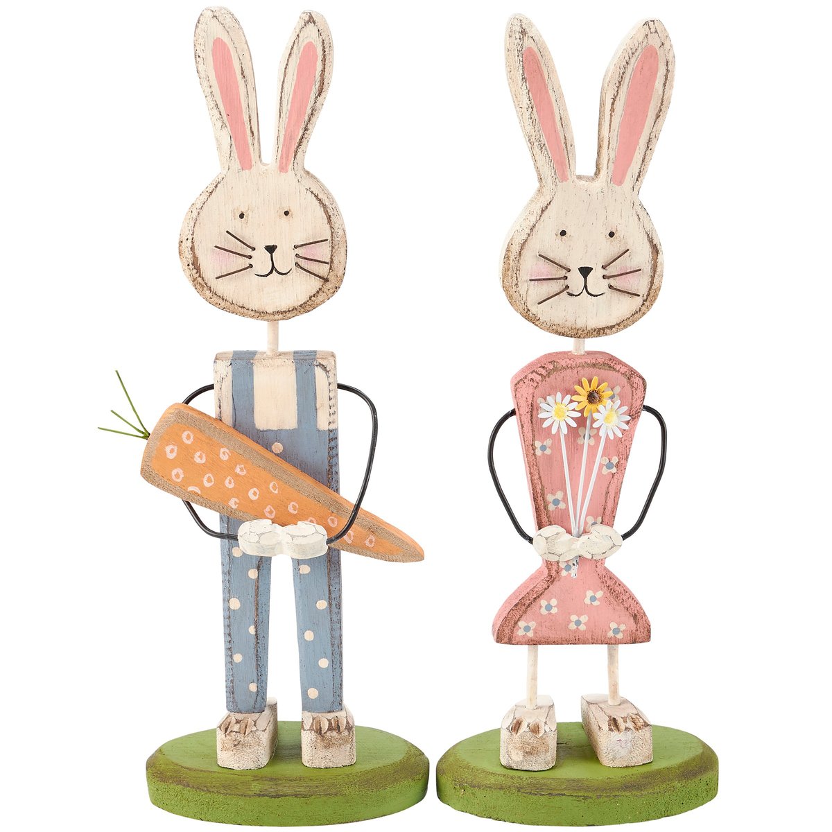 A set of two wooden sitters from our Easter & Spring Collection displaying delightful bunny designs on grass green wooden bases. Designs include a bunny wearing polka dot overalls and holding a large carrot as well as a bunny wearing a flower dress and holding spring flowers. Bunnies are recreated from an original hand carved and painted piece with distressed details. Sitters feature wire and painted accents to create a handmade feel. Our Bunny Couple stand up set is designed to free-stand alone on flat surface. A set of fun seasonal home accents that adds character to any display.
