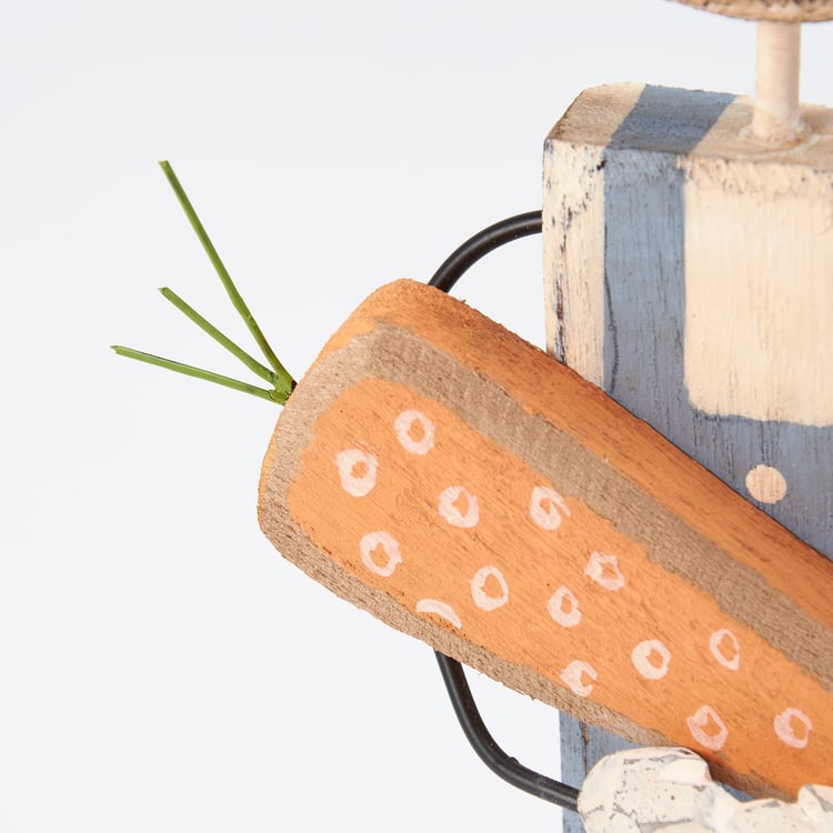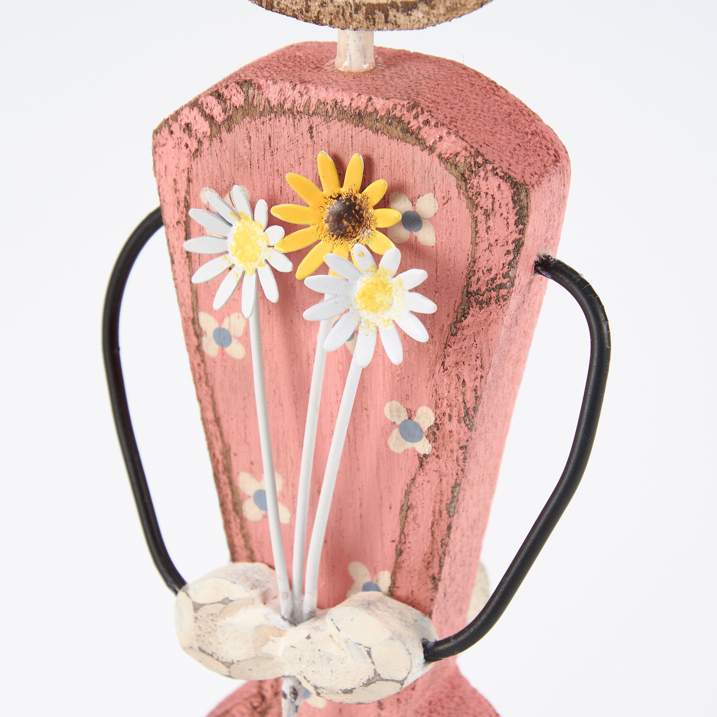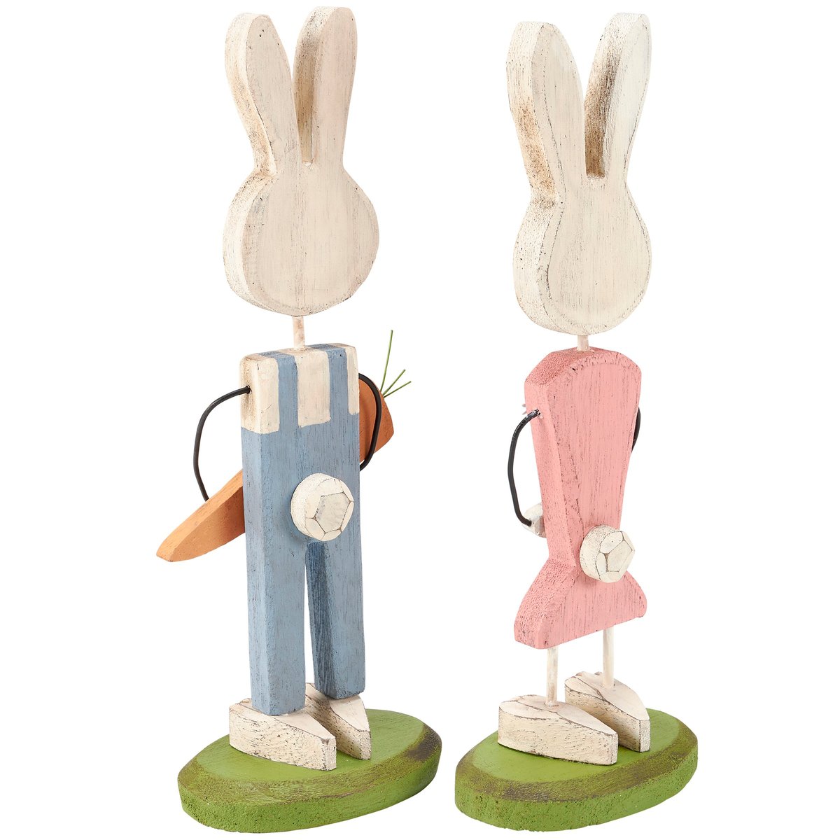 A set of two wooden sitters from our Easter & Spring Collection displaying delightful bunny designs on grass green wooden bases. Designs include a bunny wearing polka dot overalls and holding a large carrot as well as a bunny wearing a flower dress and holding spring flowers. Bunnies are recreated from an original hand carved and painted piece with distressed details. Sitters feature wire and painted accents to create a handmade feel. Our Bunny Couple stand up set is designed to free-stand alone on flat surface. A set of fun seasonal home accents that adds character to any display.