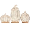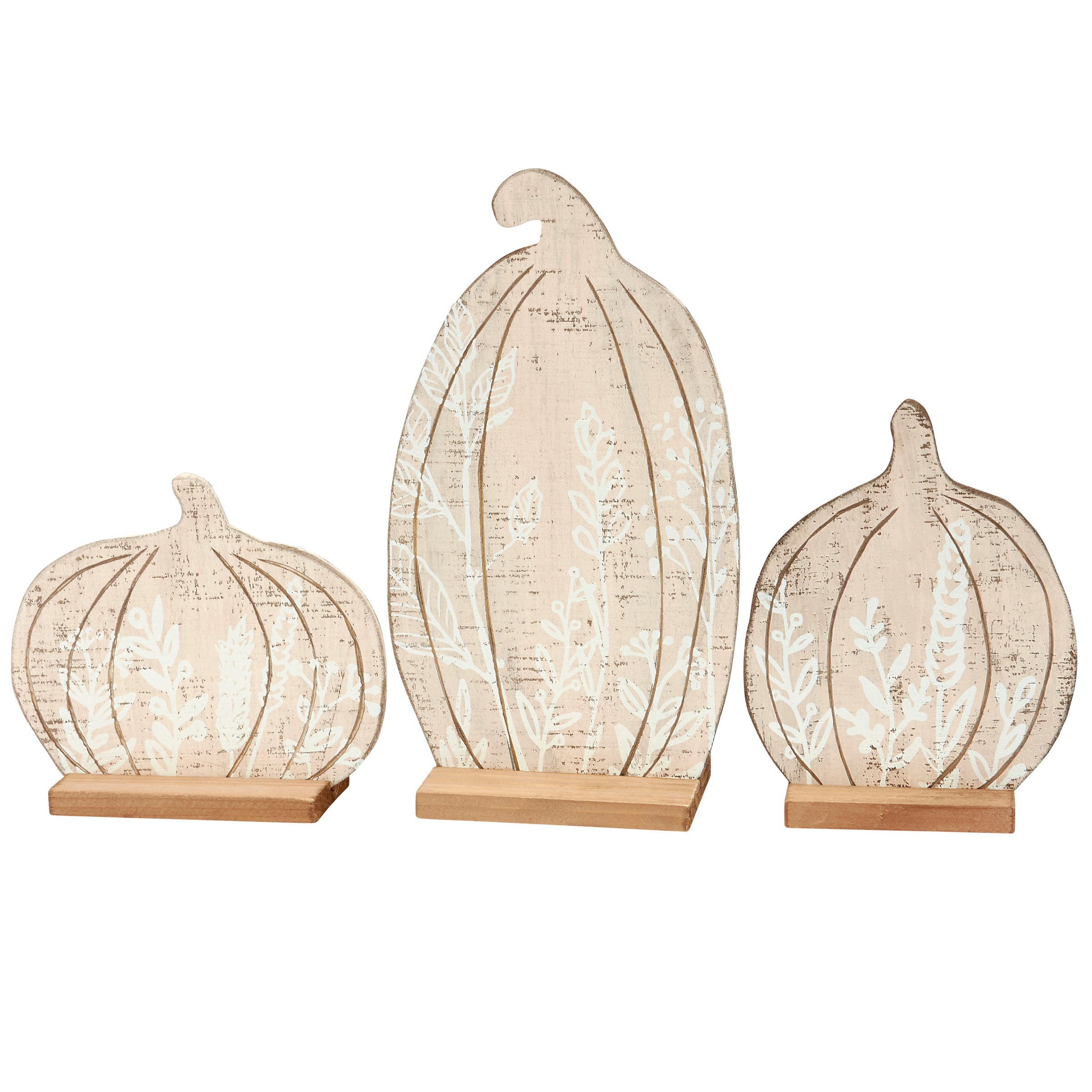 A set of 3 wooden stand ups from our Fall & Harvest Collection displaying individual cutout designs of pumpkins in natural wood with painted floral accents and carved details. Seasonal stand up set is double-sided to easily view art on either side and attached to natural wood bases. Our Floral Pumpkins stand up set is designed to free stand on a flat surface for easy display. A rustic set of fall home accents with a variety of seasonal display options.