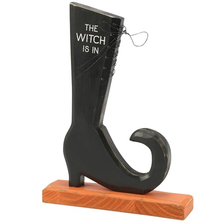 A wooden stand up decor piece from our Halloween Collection displaying a fun rustic witch boot design recreated from an original hand carved and painted piece with distressed details. Witch boot stand up is double-sided to easily switch between two funny seasonal sentiments that read "The Witch Is In" and "The Witch Is Out." Halloween stand up features wire shoelace detail and painted accents to create a handmade feel. Our The Witch Is In stand up is designed to free-stand on a flat surface for easy display. A rustic Halloween home accent that can be easily displayed in any home or work space.