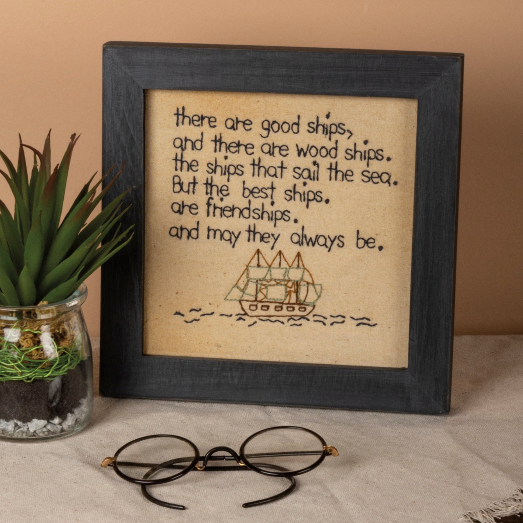 A framed pulled canvas featuring a stitched "There Are Good Ships, And There Are Wood Ships. The Ships That Sail The Sea. But The Best Ships Are Friendships, And May They Always Be" sentiment with ship and water designs.