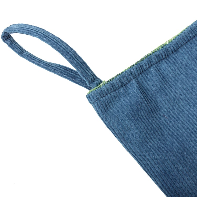 A cotton Christmas stocking featuring a blue holiday plaid pattern with a coordinating corduroy cuff. Includes a loop for easy hanging.