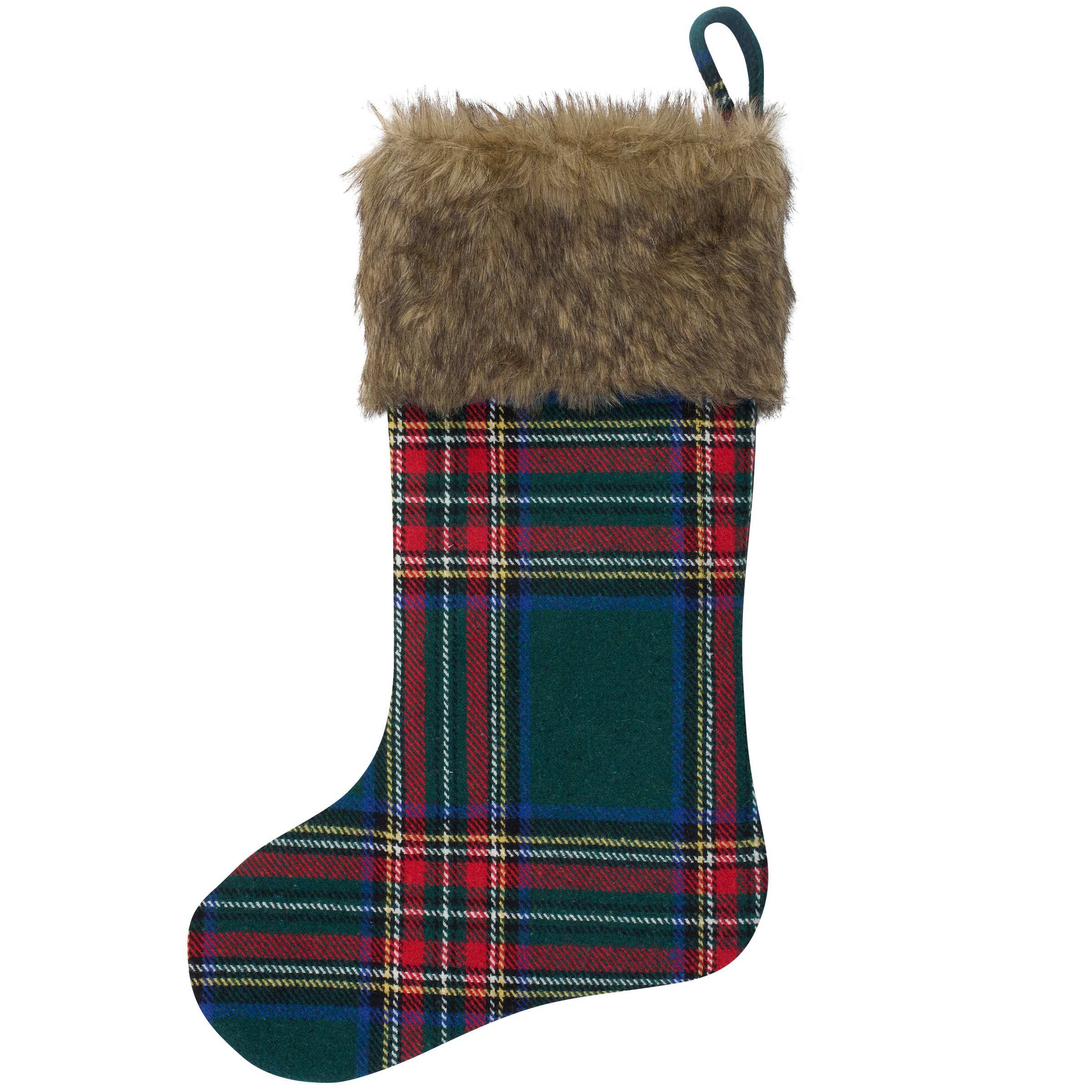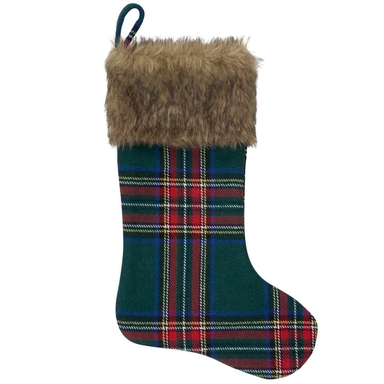 A double-sided stocking from our Christmas Collection displaying a Christmas green plaid design with a faux fur cuff that coordinates well with cabin decor. Our Cabin Christmas Plaid stocking is ready to hang via the loop attached to the top. A rustic Christmas home accent perfect for seasonal decorating and holiday gifting.