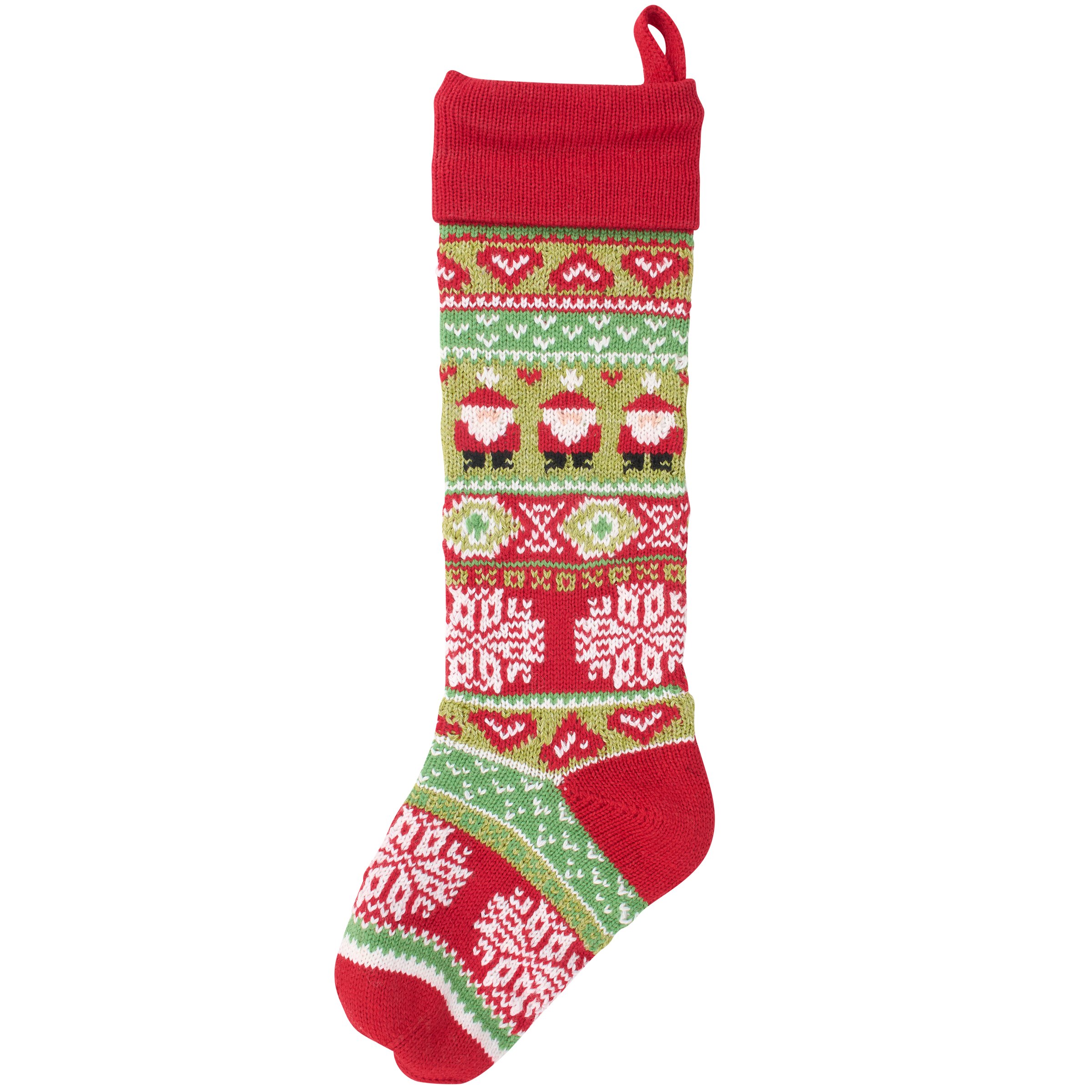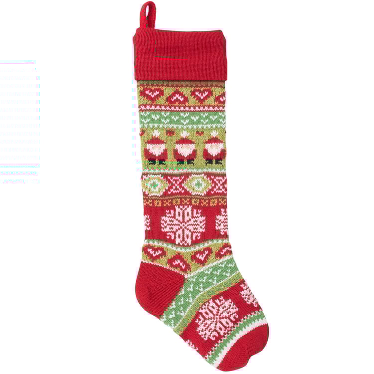 A double-sided stocking from our Christmas Collection displaying colorful knit designs of Santas and classic holiday stocking patterns throughout the stocking. Our Knit Santas stocking is ready to hang via the loop attached to the top. A vintage Christmas home accent perfect for seasonal decorating and holiday gifting.