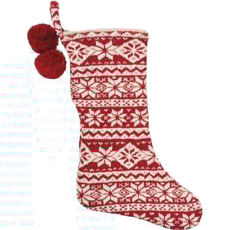 A rustic, Nordic-inspired thick cotton knit stocking from our Christmas Collection with pom pom details and border print patterned designs. Contains top loop for easy hanging and decorating. Our Nordic Christmas Stocking complements well with coordinating design pieces for a festive and cozy home decor collection.