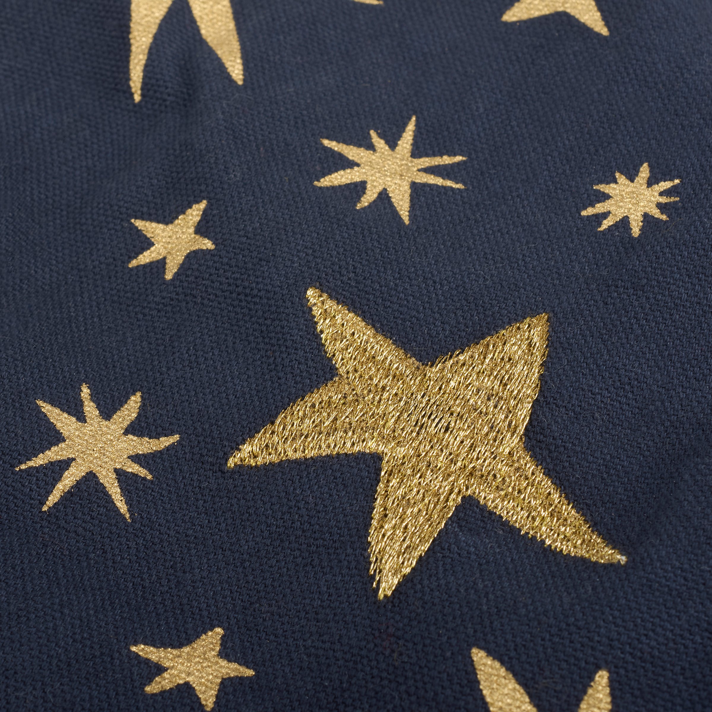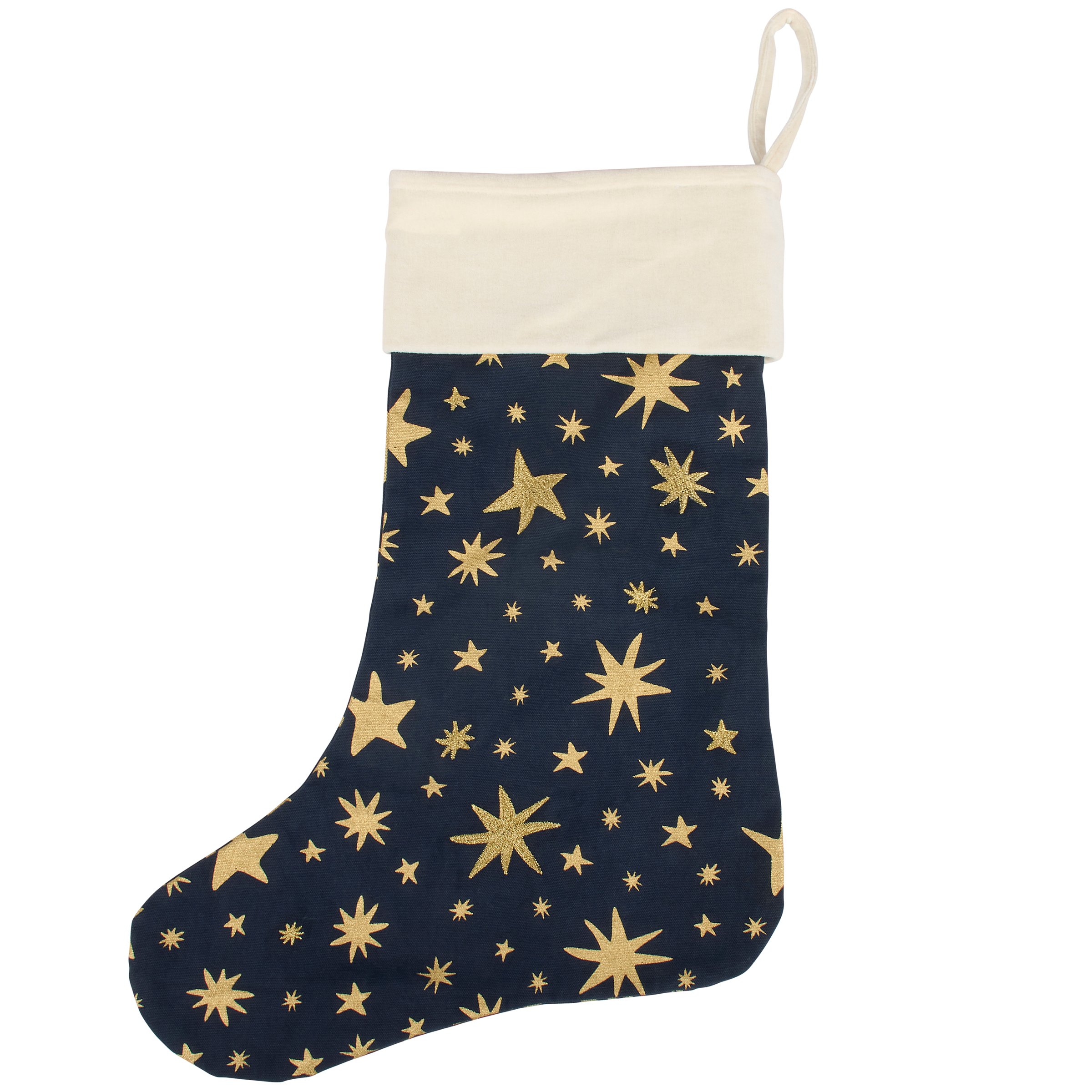 A double-sided stocking from our Christmas Collection featuring starburst designs embroidered with metallic gold thread on dark blue velvet resembling a starry night sky. Our Starry Night stocking is ready to hang via the loop attached to the top. A moody Christmas home accent perfect for seasonal decorating and holiday gifting.
