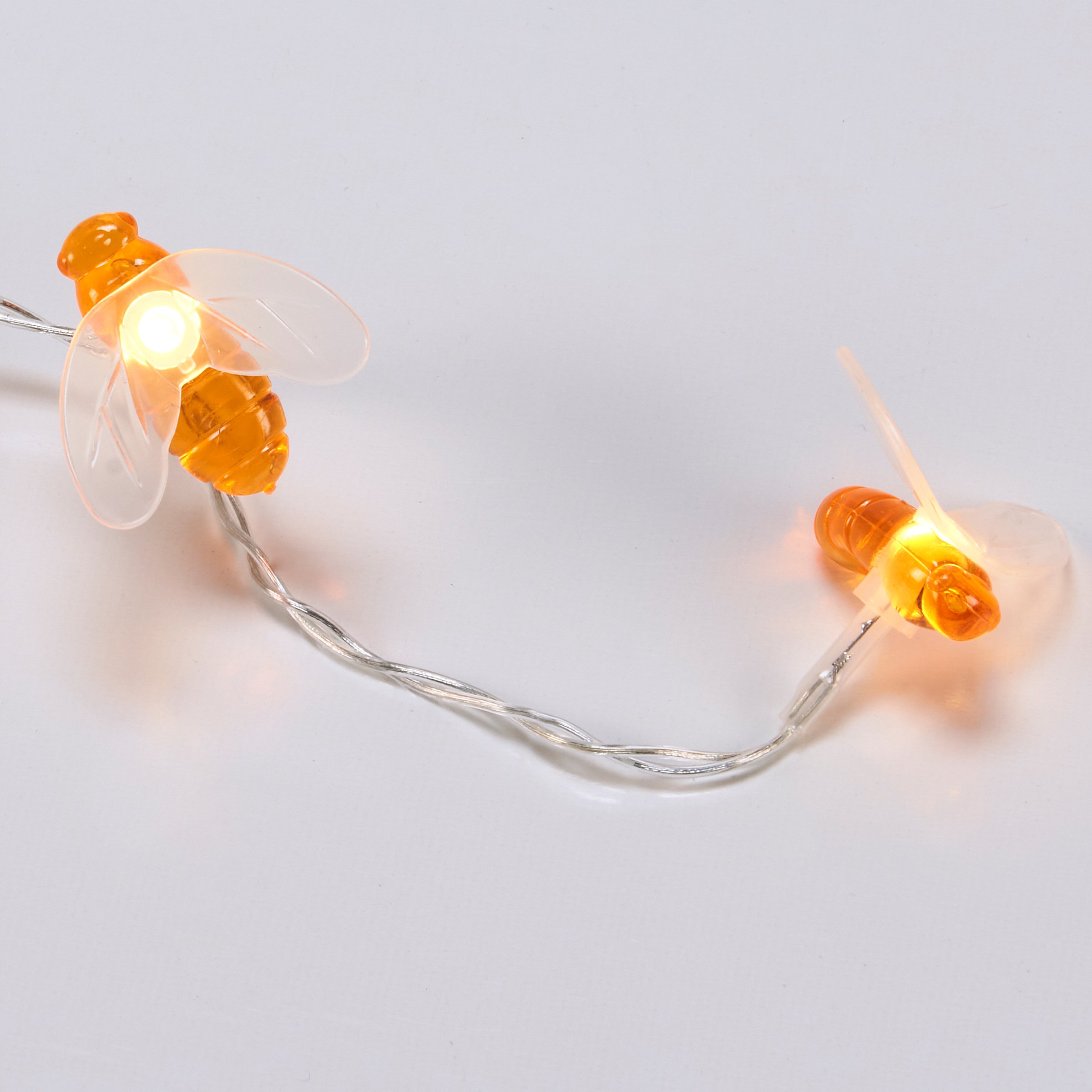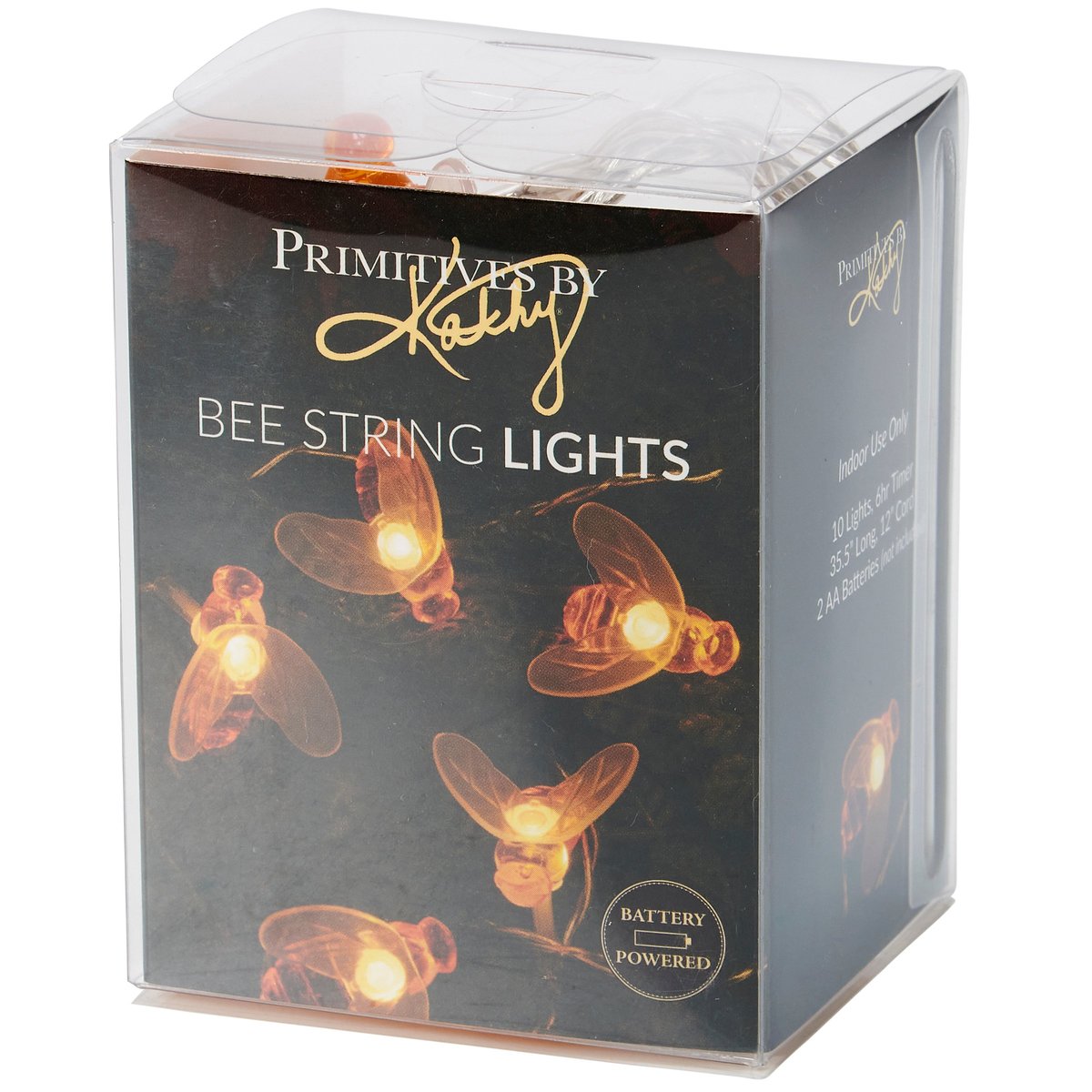 A fun set of string lights from our Garden Collection featuring light up bees perfect for adding the charm of buzzing bees to any space. String light includes 10 bee lights along a 35 inch string attached to power source and 12 inch cord. Our Bee string lights features a convenient 6 hour timer and runs on 2 AA batteries. Batteries not included. Indoor use only. Packaged in an acrylic box with insert displaying working lights and product information. A charming bee-themed home accent perfect for adding mood lighting to any room.