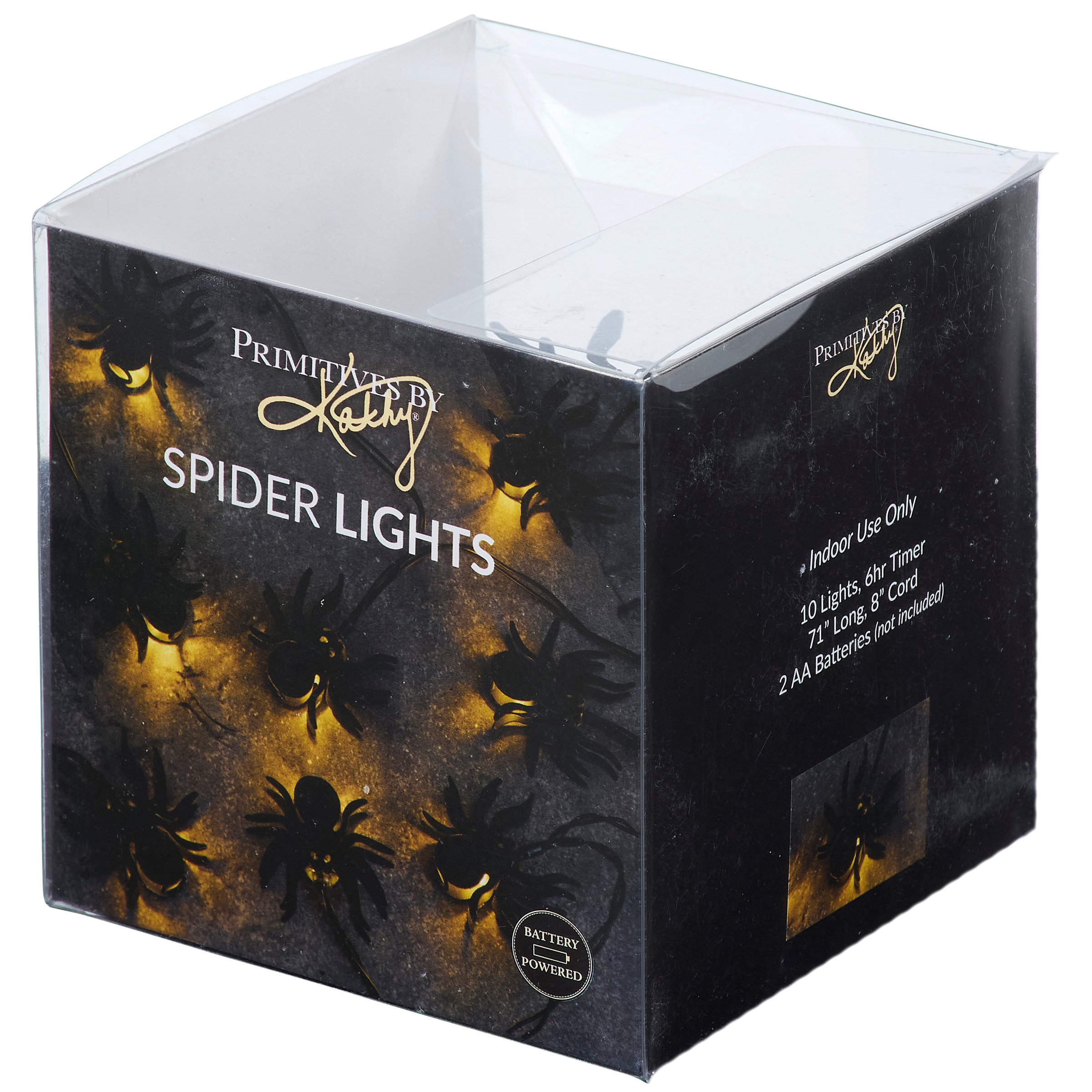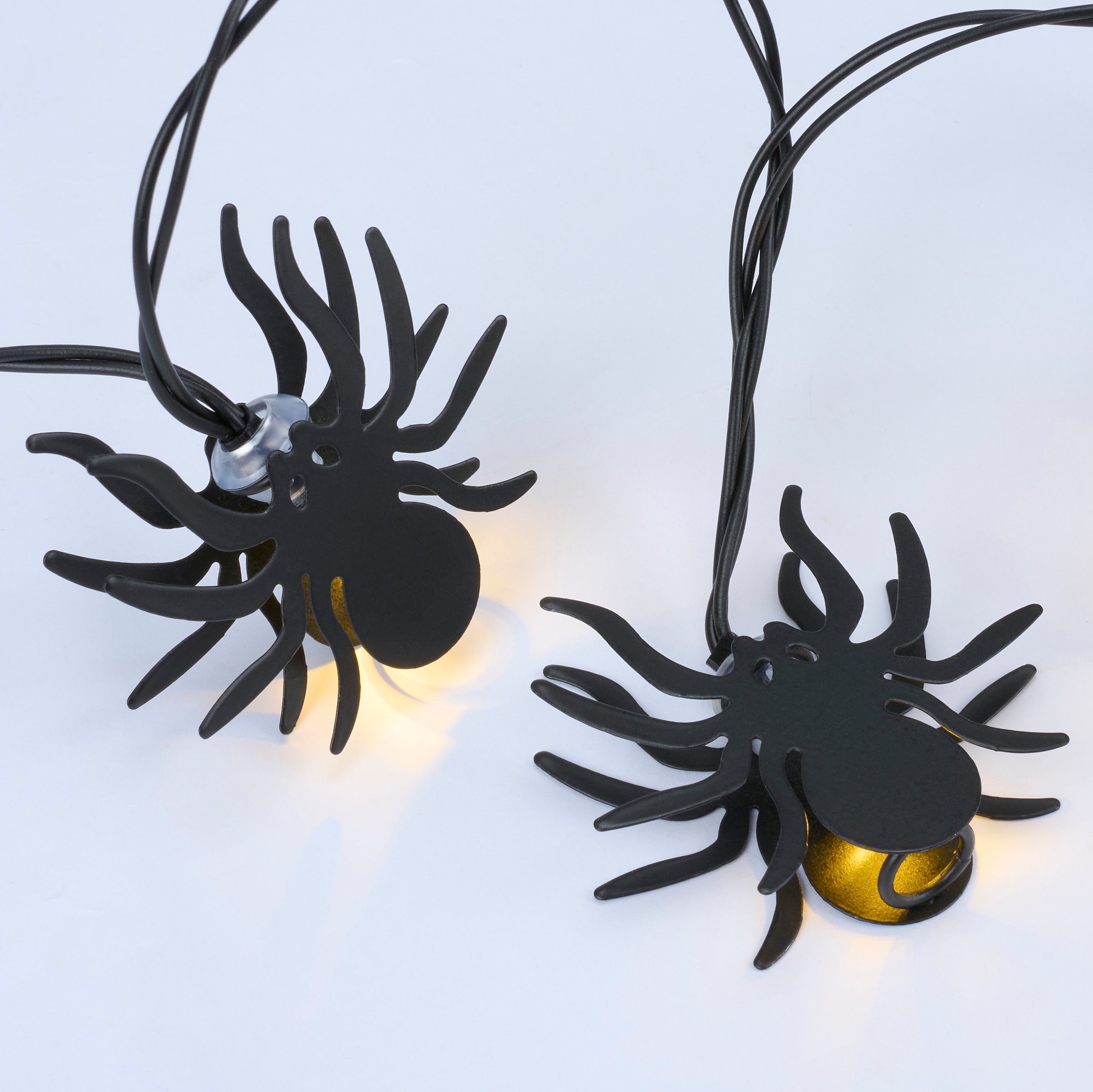A set of string lights from our Halloween Collection featuring metal light up spider designs. This set of Halloween string lights includes 10 lights along a 71 inch wire attached to power source and 8 inch cord. Our Glowing Spider string lights feature a convenient 6 hour timer powered by 2 AA batteries (not included). Indoor use only. Seasonal lights are packaged in an acrylic box with insert displaying working lights and product information. A fun Halloween home accent perfect for adding seasonal lighting to any room or display.