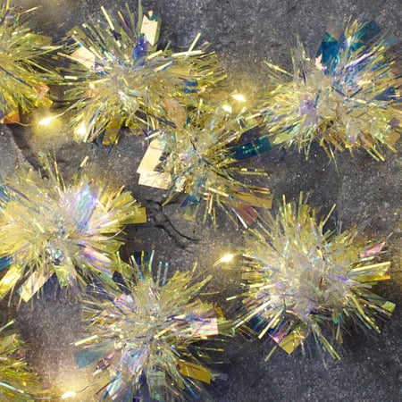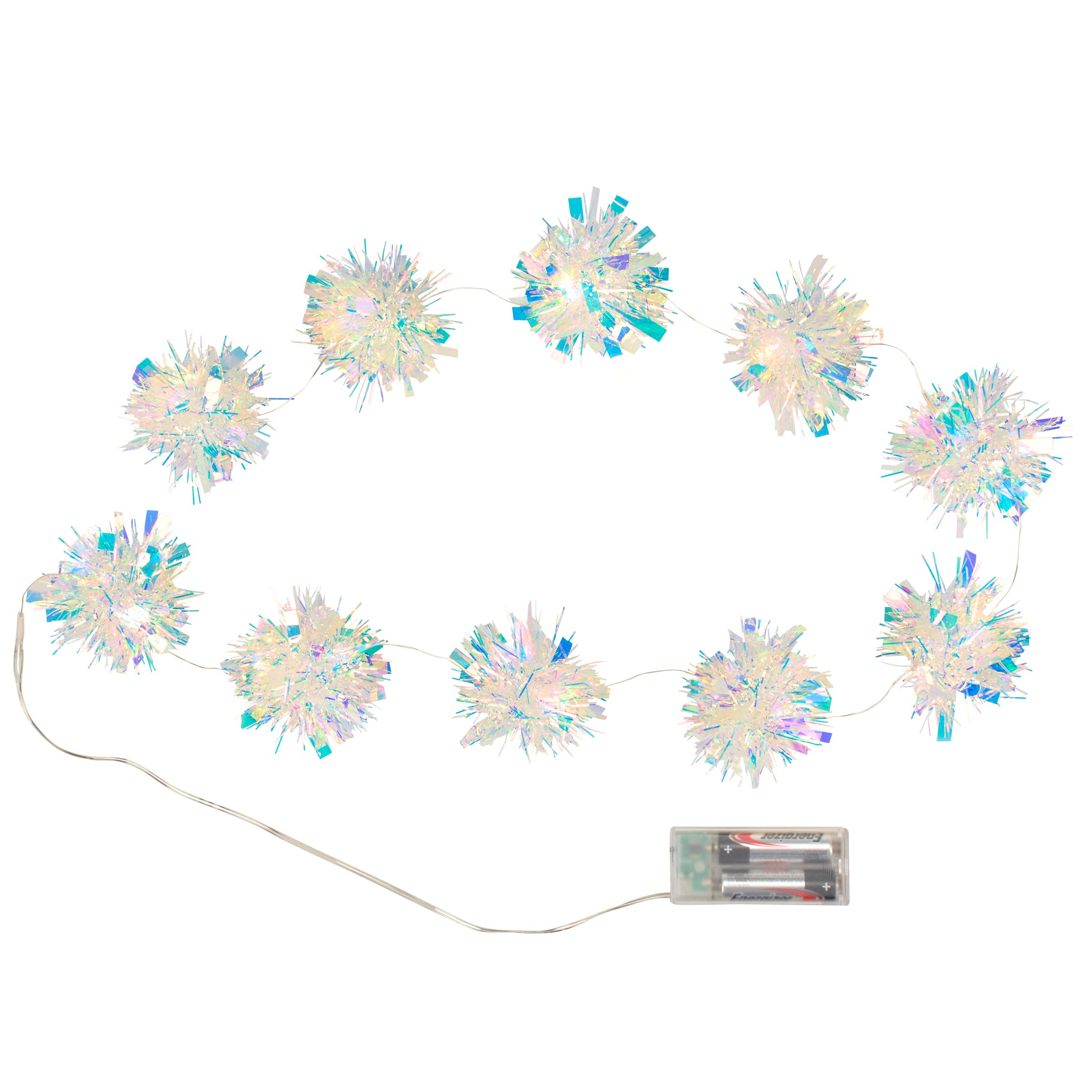 A set of string lights from our Christmas Collection featuring poms made with iridescent tinsel and accented with wire lights. This set of iridescent string lights includes 10 lights along a 60 inch wire attached to power source and 12 inch cord. Our Tinsel Poms string lights feature a convenient 6 hour timer powered by 2 AA batteries (not included). Indoor use only. Seasonal lights are packaged in an acrylic box with insert displaying working lights and product information. A retro Christmas home accent perfect for adding seasonal lighting to any room or Christmas tree.