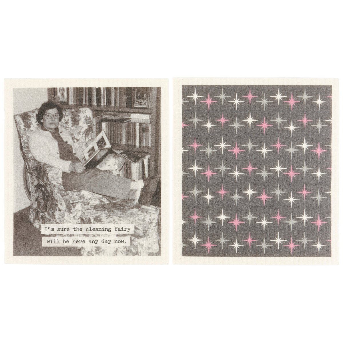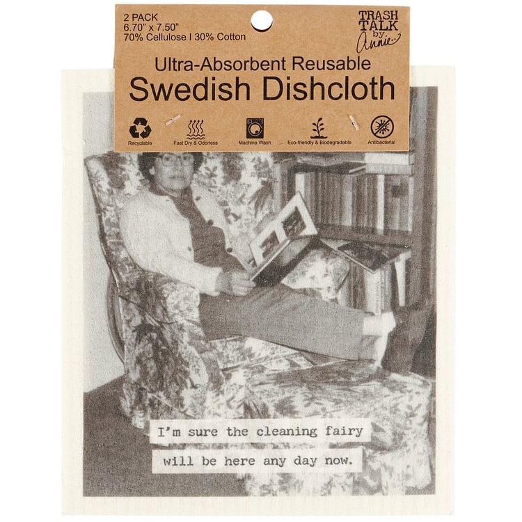 Safe to use on all types of surfaces, eco-friendly Swedish Dishcloths dry quickly and are antibacterial for more hygienic cleaning with reduced waste. This fun set of 2 Swedish Dishcloths from our Trash Talk By Annie Collection flaunts vintage inspired designs complemented with a sassy sentiment. Designs include a vintage black and white photograph with a humorous sentiment that reads "I'm Sure The Cleaning Fairy Will Be Here Any Day Now." on one dishcloth and a retro pink and gray pattern on the other dishcloth. Our Cleaning Fairy Swedish dishcloth set is ultra-absorbent and conveniently machine-washable for easy cleaning and reuse. Dishcloths are attached to header card with hole for easy rack display. A set of reusable dishcloths with vintage style perfect for replacing dull sponges and paper towels with long-lasting fun designs.
