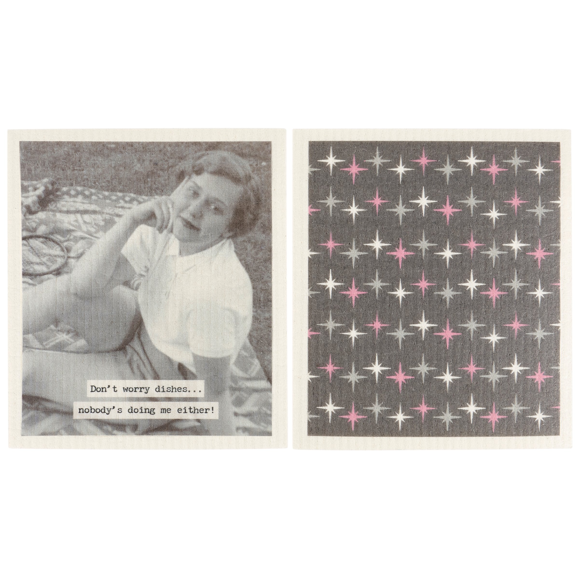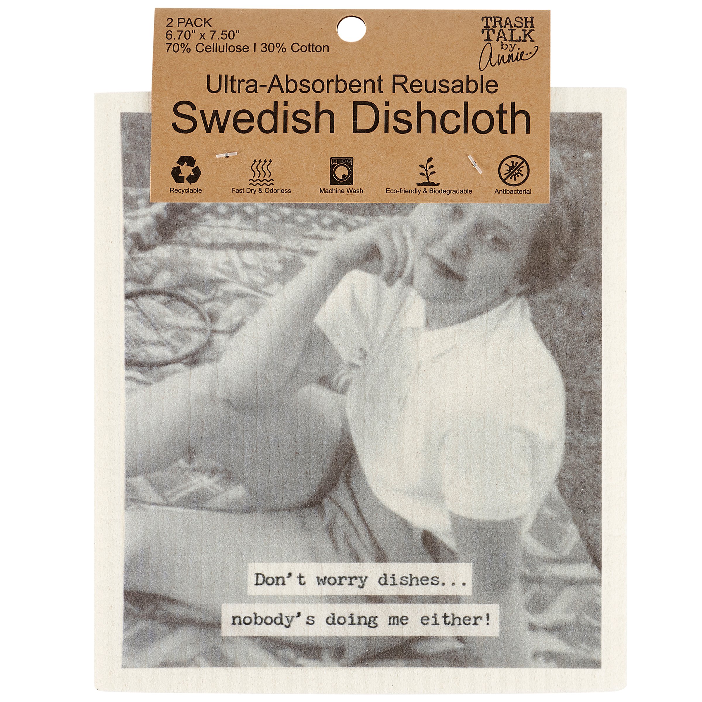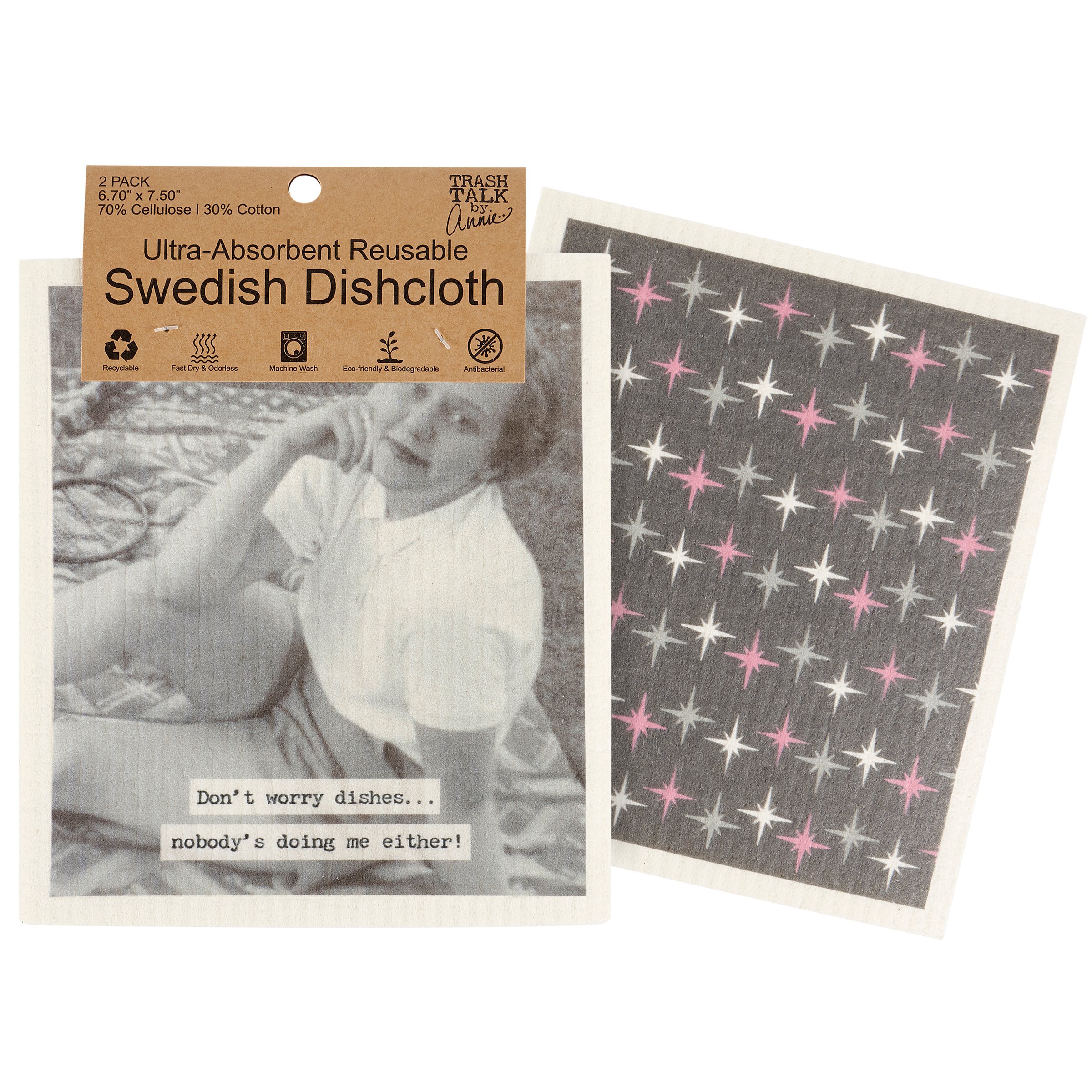 Safe to use on all types of surfaces, eco-friendly Swedish Dishcloths dry quickly and are antibacterial for more hygienic cleaning with reduced waste. This fun set of 2 Swedish Dishcloths from our Trash Talk By Annie Collection flaunts vintage inspired designs complemented with a sassy sentiment. Dishcloth designs include a vintage black and white photograph with a sassy kitchen themed sentiment that reads "Don't Worry Dishes... Nobody Is Doing Me Either!" on one dishcloth and a retro pink and gray pattern on the other dishcloth. Our Don't Worry Dishes Swedish cloth set is ultra-absorbent and conveniently machine-washable for easy cleaning and reuse. Each set of dishcloths is attached to a header card with hole for easy rack display. A set of reusable dishcloths with vintage style perfect for replacing dull sponges and paper towels with long-lasting fun designs.