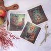 Safe to use on all types of surfaces, eco-friendly Swedish Dishcloths dry quickly and are antibacterial for more hygienic cleaning with reduced waste. This set of 3 Swedish Dishcloths from our Jewel Tone Fall Collection features charming autumn scenes of woodland animals surrounded by fall flowers in a moody color palette. Fall animal designs are replicated from original artwork painted onto burlap canvas, giving the art a unique depth and texture. Our Fall Woodland Swedish dishcloth set is ultra-absorbent and conveniently machine-washable for easy cleaning and reuse. Seasonal dishcloths are attached to header card with hole for easy store rack display. A stylish fall-themed set of reusable seasonal dishcloths perfect for replacing dull sponges and paper towels with long-lasting colorful designs.