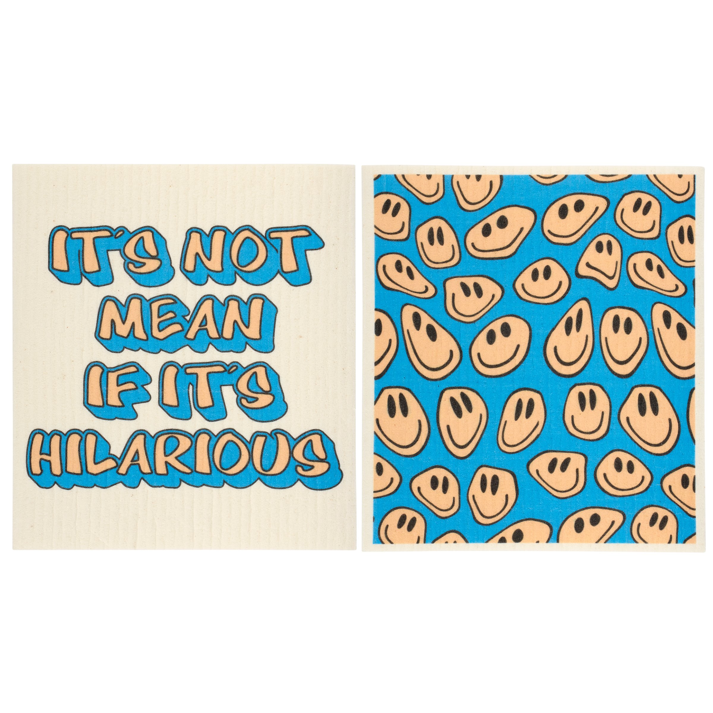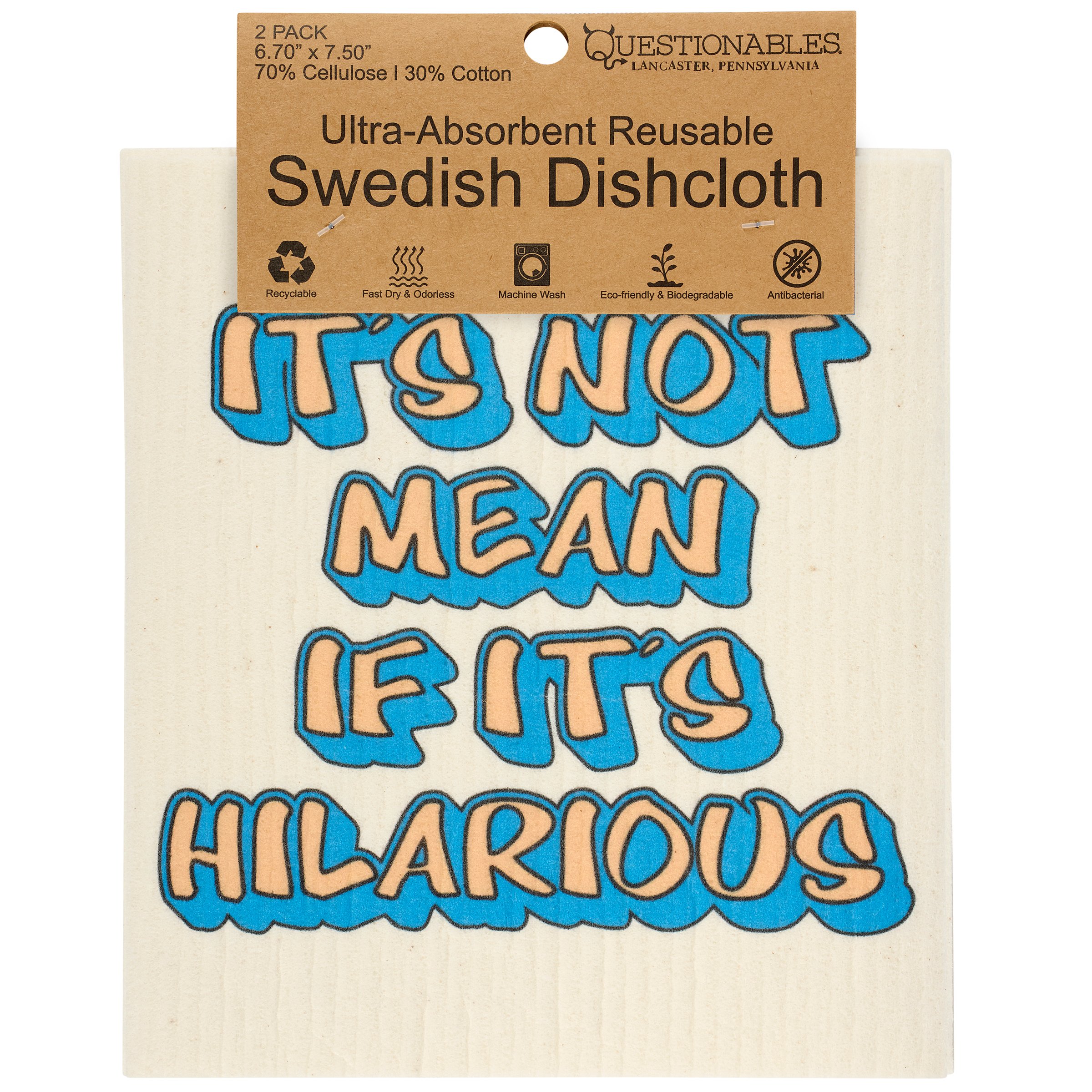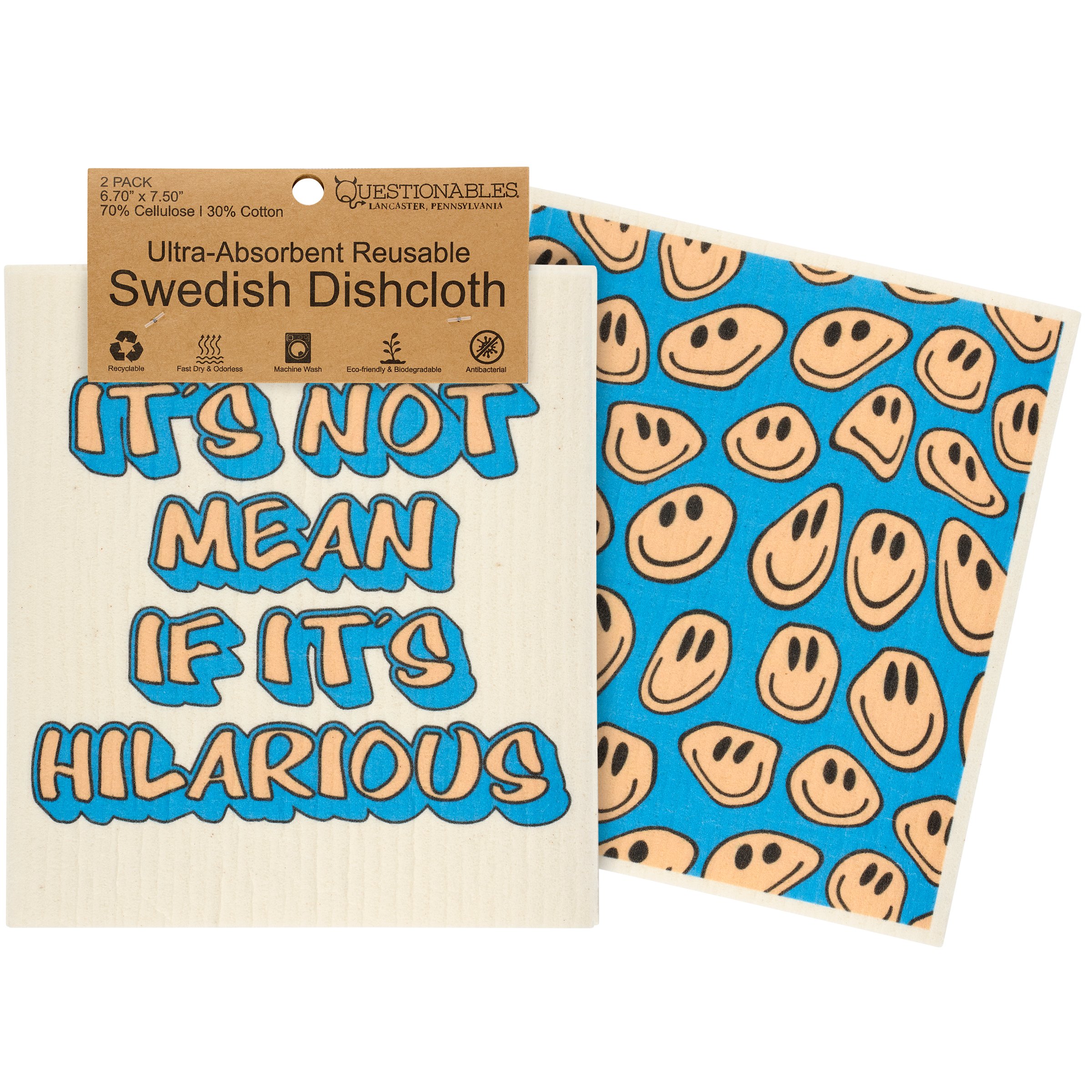 Safe to use on all types of surfaces, eco-friendly Swedish Dishcloths dry quickly and are antibacterial for more hygienic cleaning with reduced waste. This stylish set of 2 Swedish dishcloths flaunts retro inspired designs complemented with a sassy sentiment. Dishcloth designs include a sassy sentiment that reads "It's Not Mean If It's Hilarious" on one dishcloth and a retro smiley face pattern on the other dishcloth. Questionables Swedish dishcloths are ultra-absorbent to soak up whatever is thrown at them and machine washable for stress-free cleaning and reuse. Each set of dishcloths is attached to a header card with hole for easy rack display. Our If It's Hilarious reusable dishcloths call back to a retro style but with modern mentality making them perfect for everyday self expression while replace dull sponges and paper towels with long-lasting colorful designs.