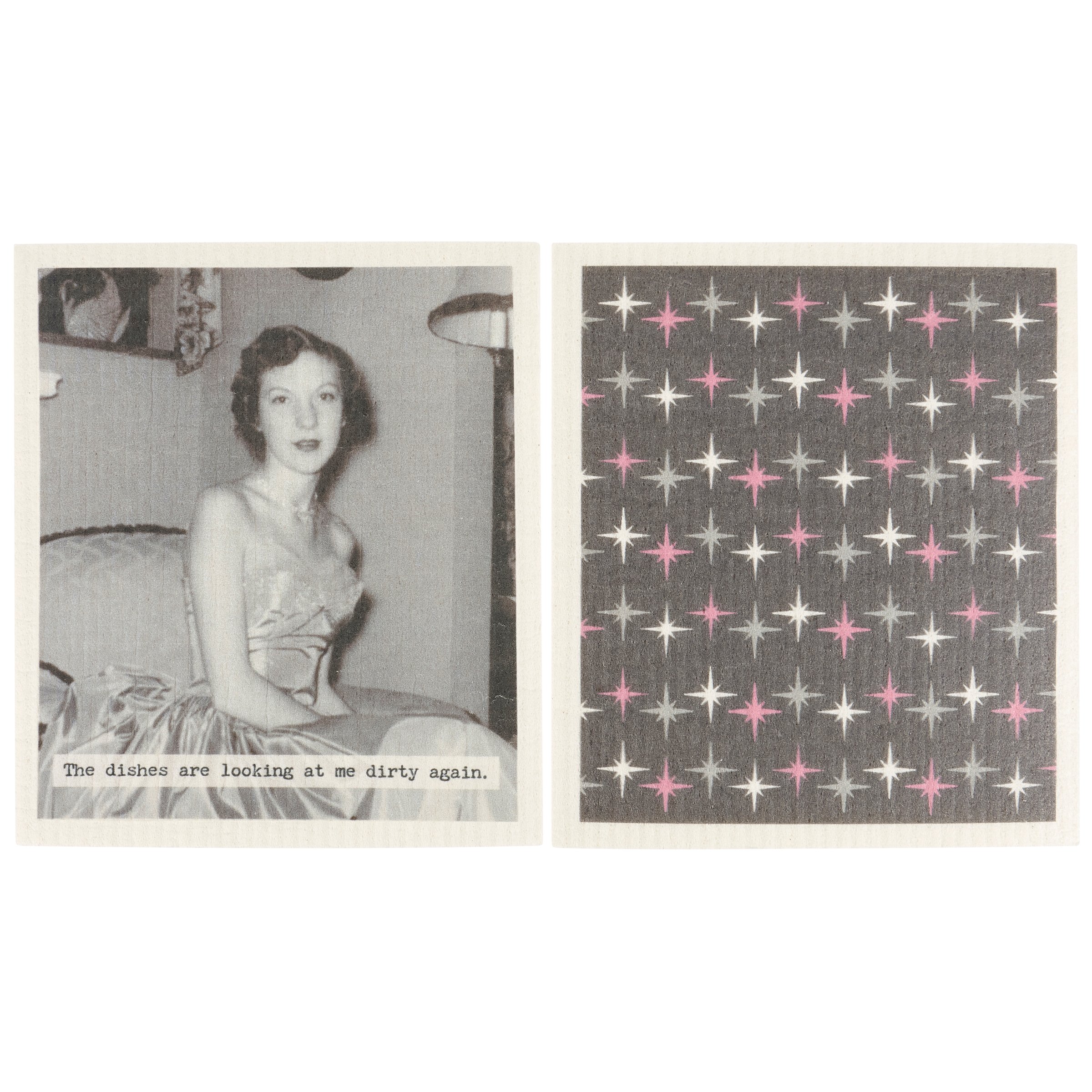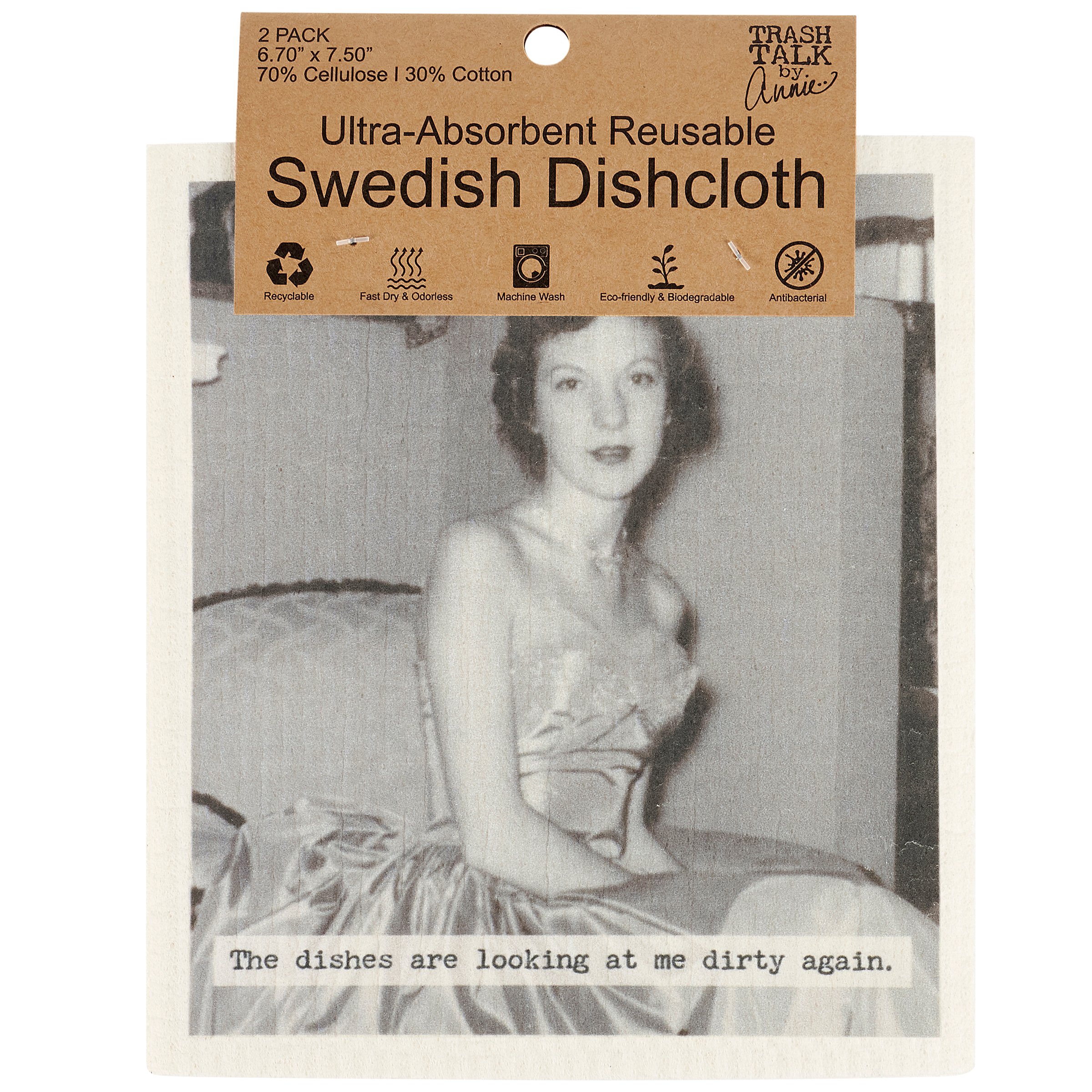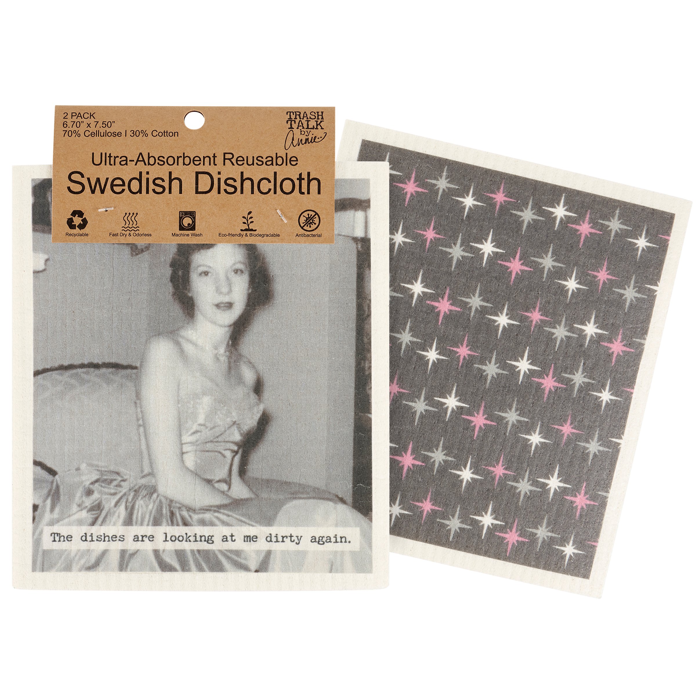 Safe to use on all types of surfaces, eco-friendly Swedish Dishcloths dry quickly and are antibacterial for more hygienic cleaning with reduced waste. This fun set of 2 Swedish Dishcloths from our Trash Talk By Annie Collection flaunts vintage inspired designs complemented with a sassy sentiment. Dishcloth designs include a vintage black and white photograph with a sassy kitchen themed sentiment that reads "The Dishes Are Looking At Me Dirty Again." on one dishcloth and a retro pink and gray pattern on the other dishcloth. Our Dishes Are Looking At Me Swedish cloth set is ultra-absorbent and conveniently machine-washable for easy cleaning and reuse. Each set of dishcloths is attached to a header card with hole for easy rack display. A set of reusable dishcloths with vintage style perfect for replacing dull sponges and paper towels with long-lasting fun designs.