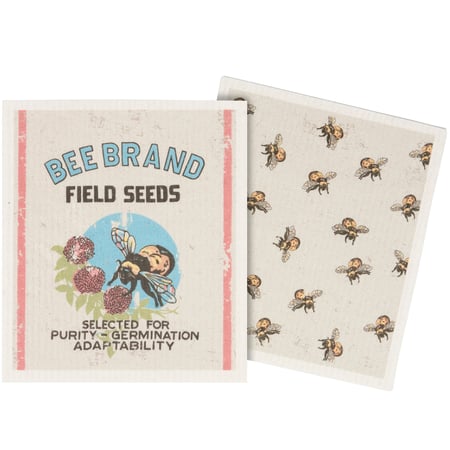 Safe to use on all types of surfaces, eco-friendly Swedish Dishcloths dry quickly and are antibacterial for more hygienic cleaning with reduced waste. This set of two Swedish Dishcloths from our Garden Collection features vintage bee inspired designs. Designs include seed bag style design with "Bee Brand Field Seeds" sentiment on one dishcloth and a bumble bee pattern on the other dishcloth. Our Bee Brand Swedish Dishcloth set is machine-washable for convenient cleaning. Dishcloths are attached to header card with hole for easy rack display. A fun bee-themed set of reusable dishcloths perfect for replacing dull sponges and paper towels with long-lasting colorful designs.