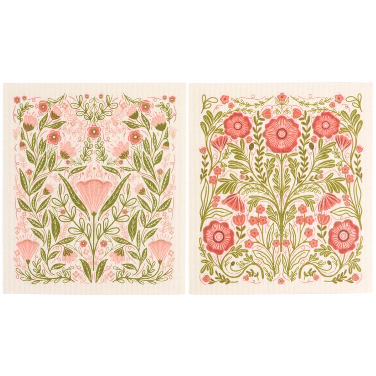 Safe to use on all types of surfaces, eco-friendly Swedish Dishcloths dry quickly and are antibacterial for more hygienic cleaning with reduced waste. This set of two Swedish Dishcloths from our Folk Art Collection features intricate pink and red floral patterns on each. Floral designs are replicated from original hand illustrated art inspired by folk art. Our Botanical Swedish dishcloth set is ultra-absorbent and conveniently machine-washable for easy cleaning and reuse. Dishcloths are attached to header card with hole for easy rack display. A stylish floral-themed set of reusable dishcloths perfect for replacing dull sponges and paper towels with long-lasting colorful designs.