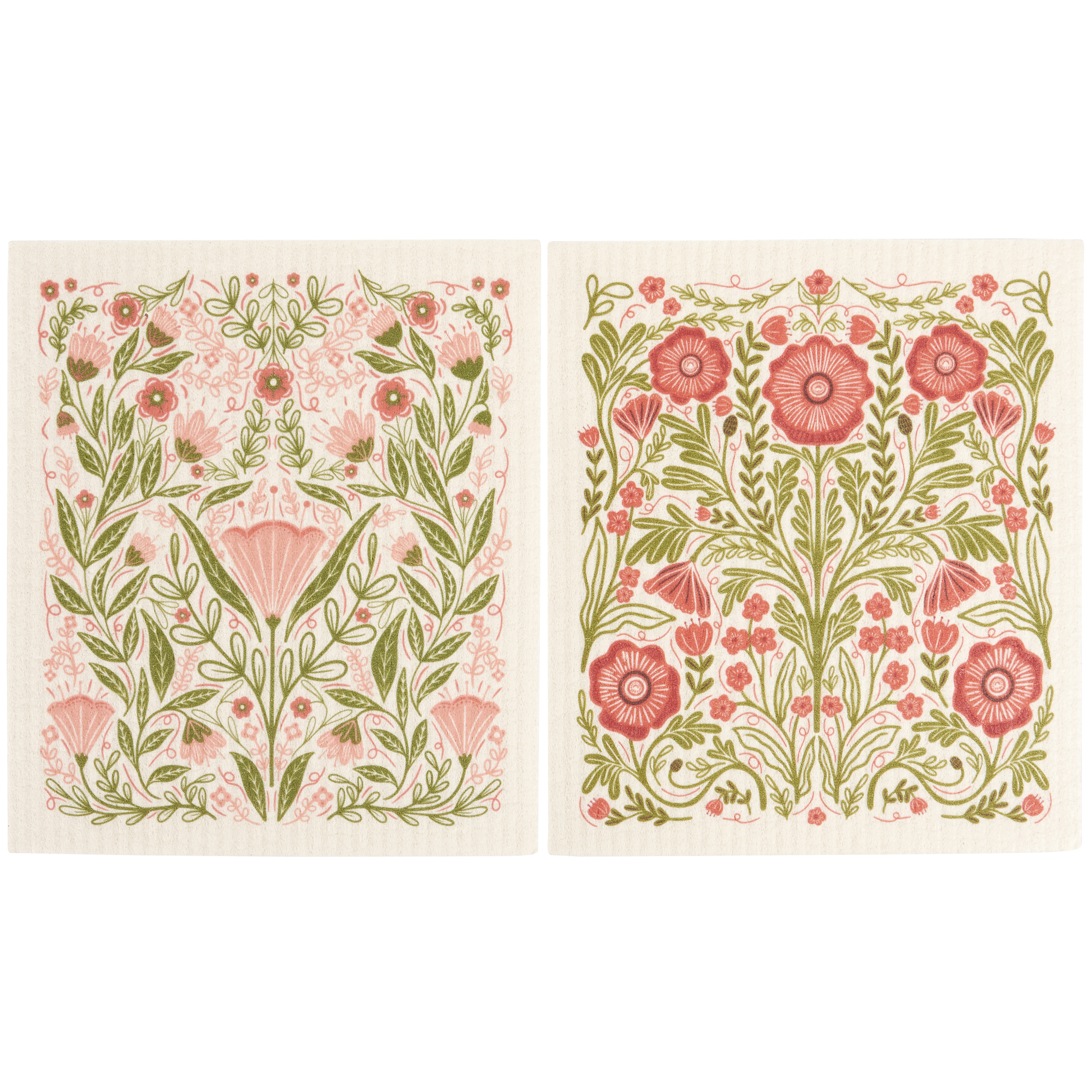 Safe to use on all types of surfaces, eco-friendly Swedish Dishcloths dry quickly and are antibacterial for more hygienic cleaning with reduced waste. This set of two Swedish Dishcloths from our Folk Art Collection features intricate pink and red floral patterns on each. Floral designs are replicated from original hand illustrated art inspired by folk art. Our Botanical Swedish dishcloth set is ultra-absorbent and conveniently machine-washable for easy cleaning and reuse. Dishcloths are attached to header card with hole for easy rack display. A stylish floral-themed set of reusable dishcloths perfect for replacing dull sponges and paper towels with long-lasting colorful designs.
