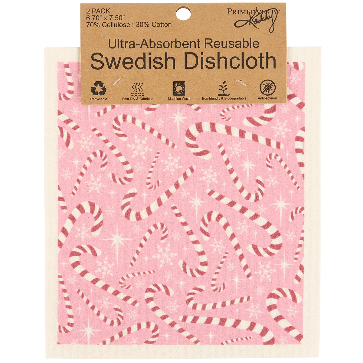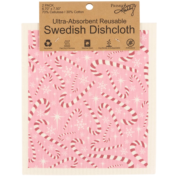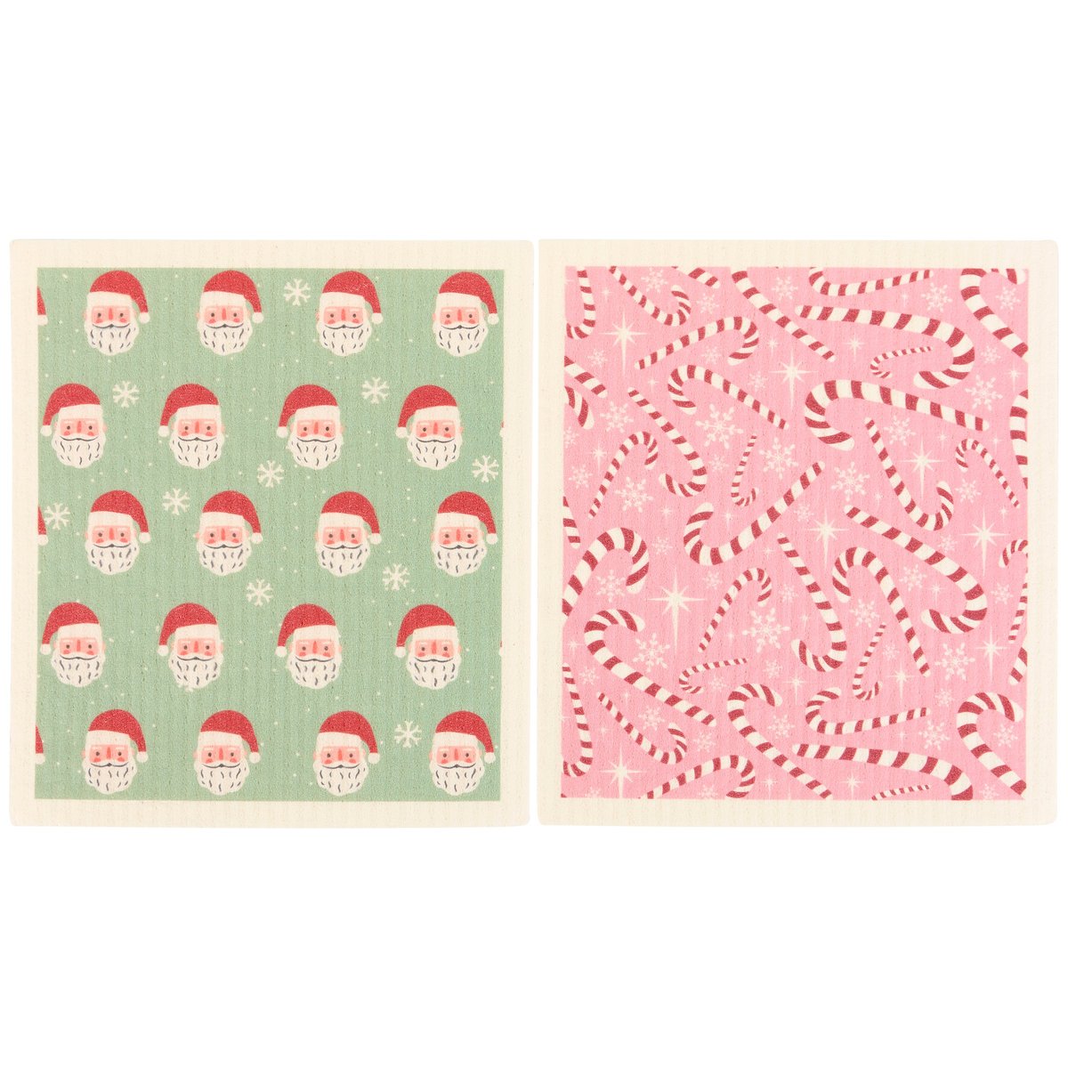 Safe to use on all types of surfaces, eco-friendly Swedish Dishcloths dry quickly and are antibacterial for more hygienic cleaning with reduced waste. This set of 2 Swedish Dishcloths from our Christmas Collection features patterns of candy canes and Santa heads in a fun retro pastel style. Our Candy Canes Swedish cloth set is ultra-absorbent and conveniently machine-washable for easy cleaning and reuse. Seasonal dishcloths are attached to header card with hole for easy store rack display. A fun retro pastel set of reusable Christmas dishcloths perfect for replacing dull sponges and paper towels with long-lasting colorful designs.