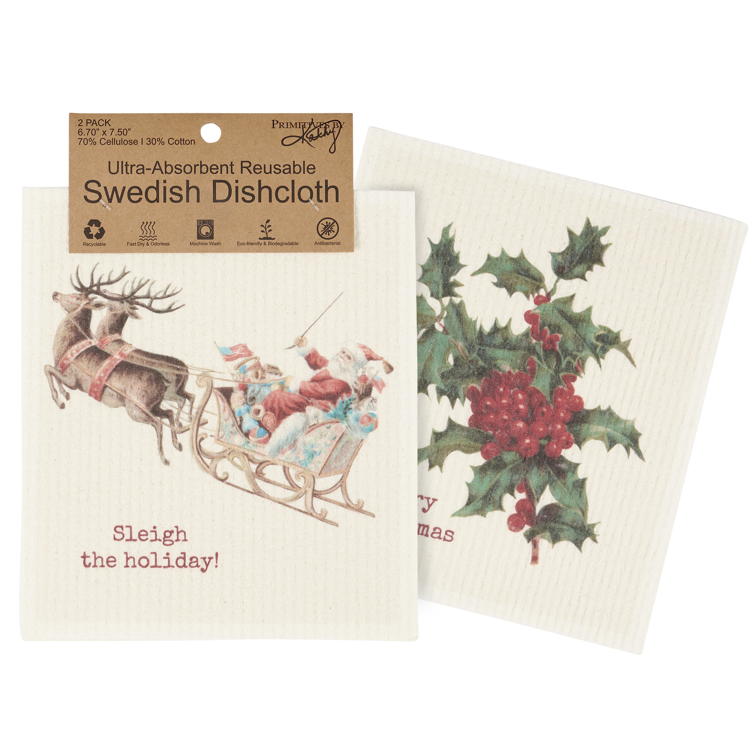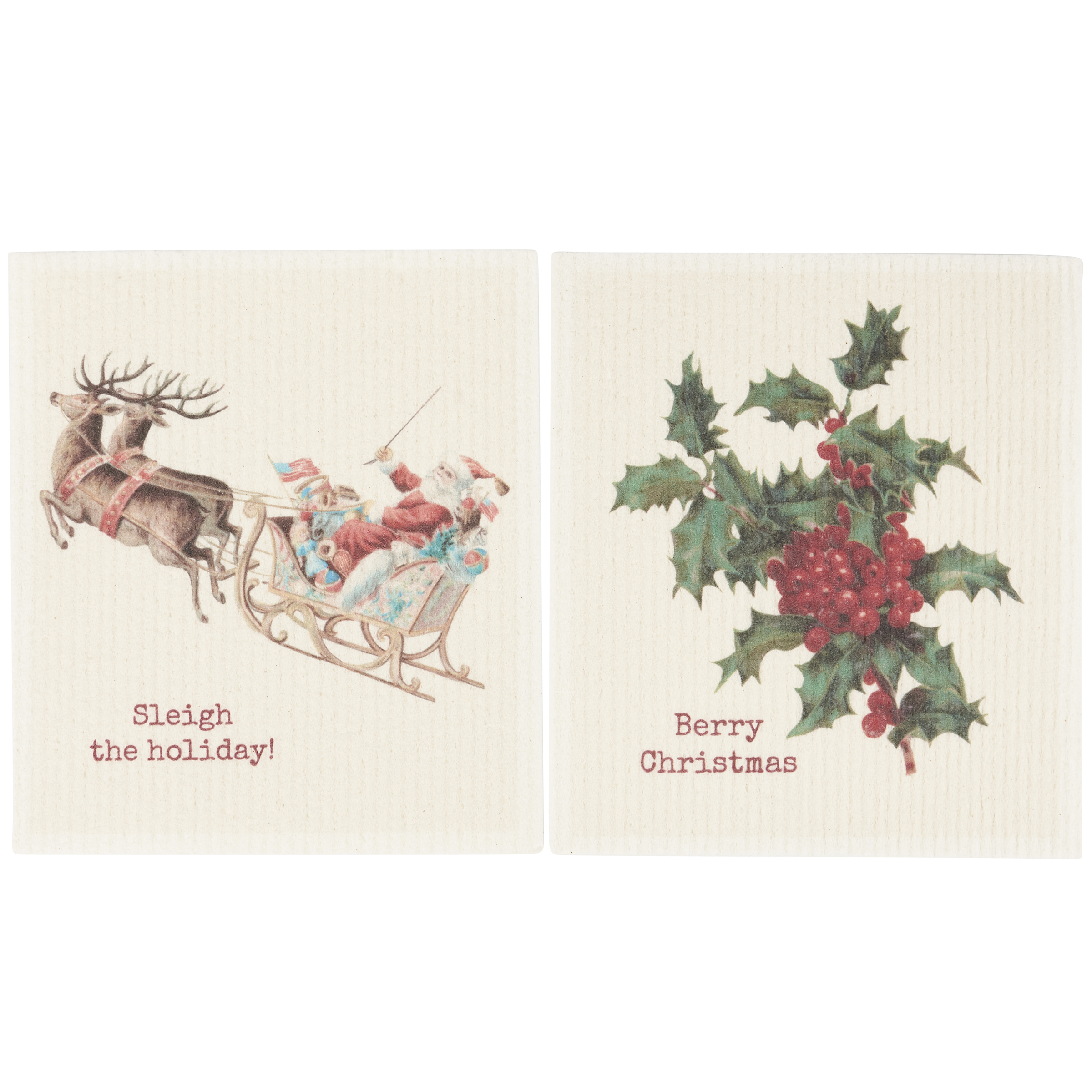 Safe to use on all types of surfaces, eco-friendly Swedish Dishcloths dry quickly and are antibacterial for more hygienic cleaning with reduced waste. This set of two Swedish Dishcloths from our Christmas Collection features vintage holiday designs with coordinating puns on each. Designs include Santa in his sleigh with "Sleigh The Holiday!" sentiment on one dishcloth and holly berries with a "Berry Christmas" sentiment on the other dishcloth. Our Christmas Swedish Dishcloth set is conveniently machine-washable for easy cleaning. Seasonal dishcloths are attached to header card with hole for easy rack display. A fun set of Christmas-themed reusable dishcloths perfect for replacing dull sponges and paper towels with long-lasting colorful designs.