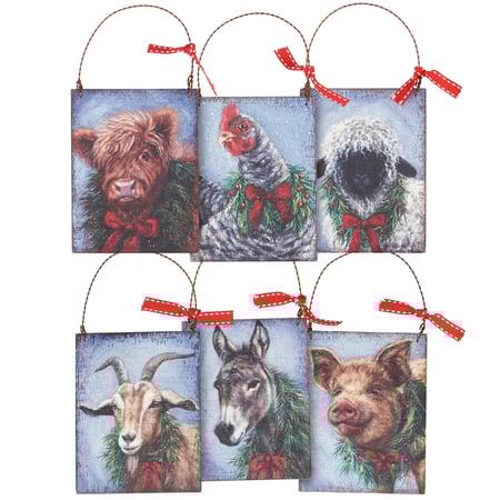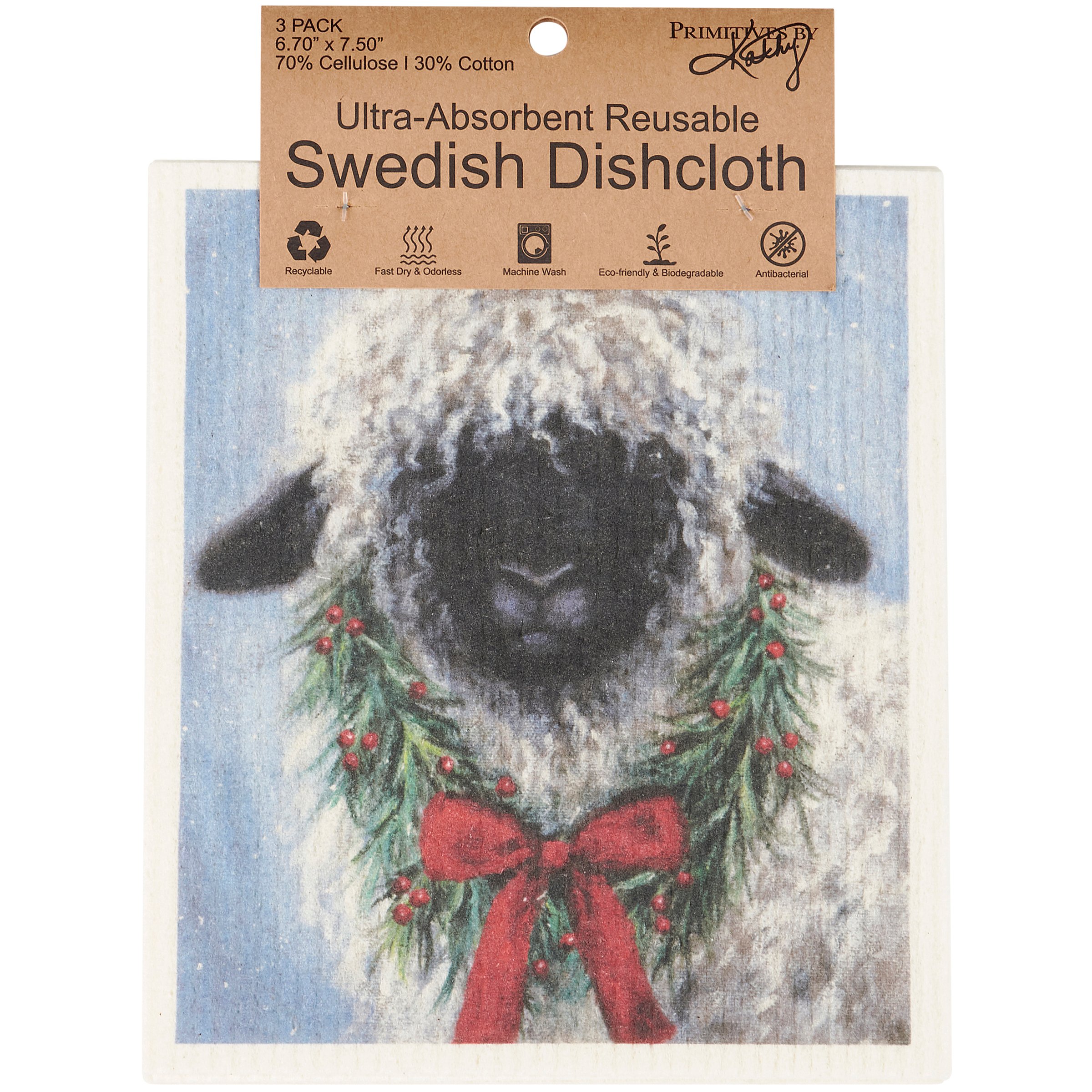 Safe to use on all types of surfaces, eco-friendly Swedish Dishcloths dry quickly and are antibacterial for more hygienic cleaning with reduced waste. This set of three Swedish Dishcloths from our Christmas Collection features comforting winter scenes of farm animals wearing Christmas wreaths. Designs are replicated from original artwork painted onto burlap canvas, giving the art a unique depth and texture. Our Christmas Animals Swedish Dishcloth set is conveniently machine-washable for easy cleaning. Seasonal dishcloths are attached to header card with hole for easy rack display. A rustic set of Christmas-themed reusable dishcloths perfect for replacing dull sponges and paper towels with long-lasting colorful designs.