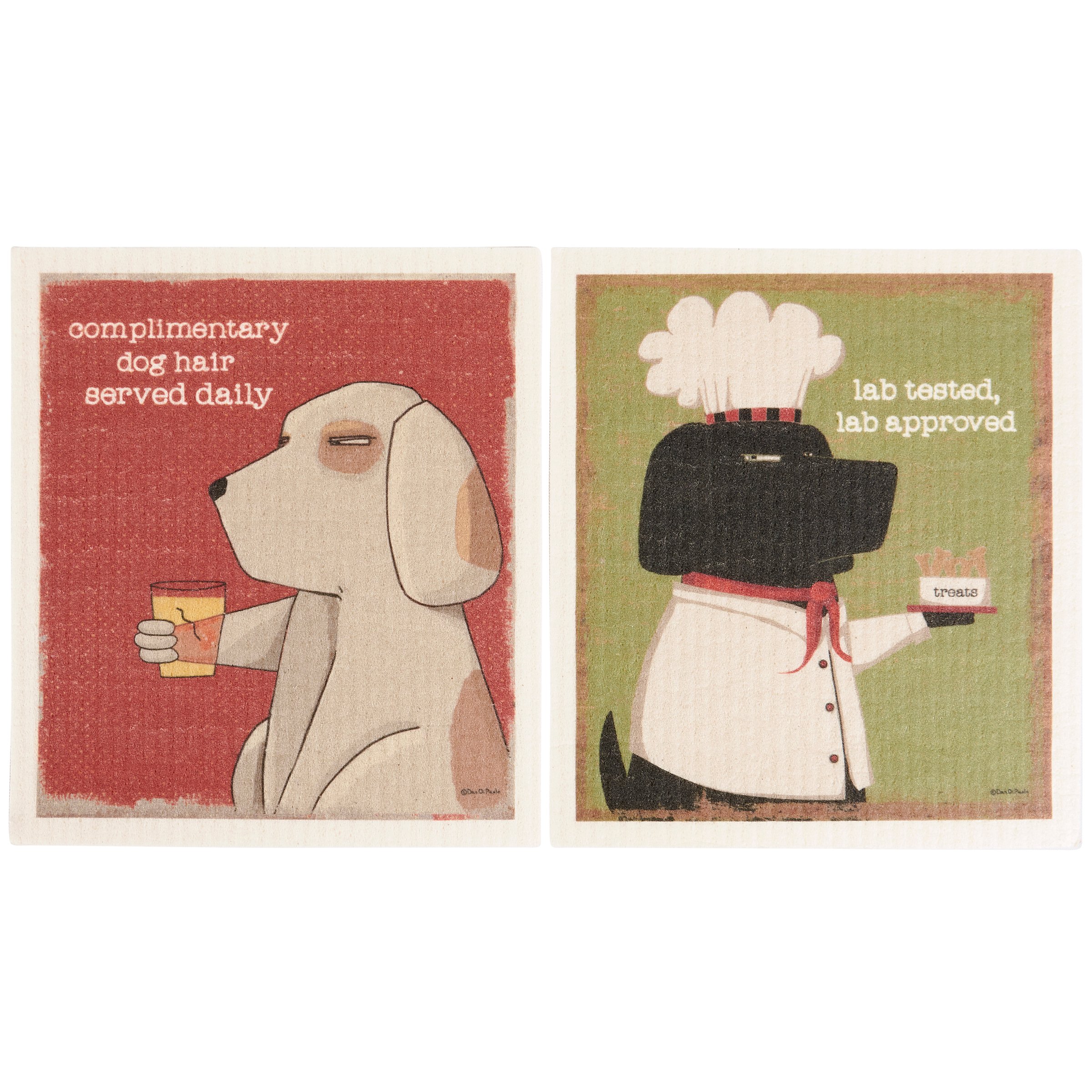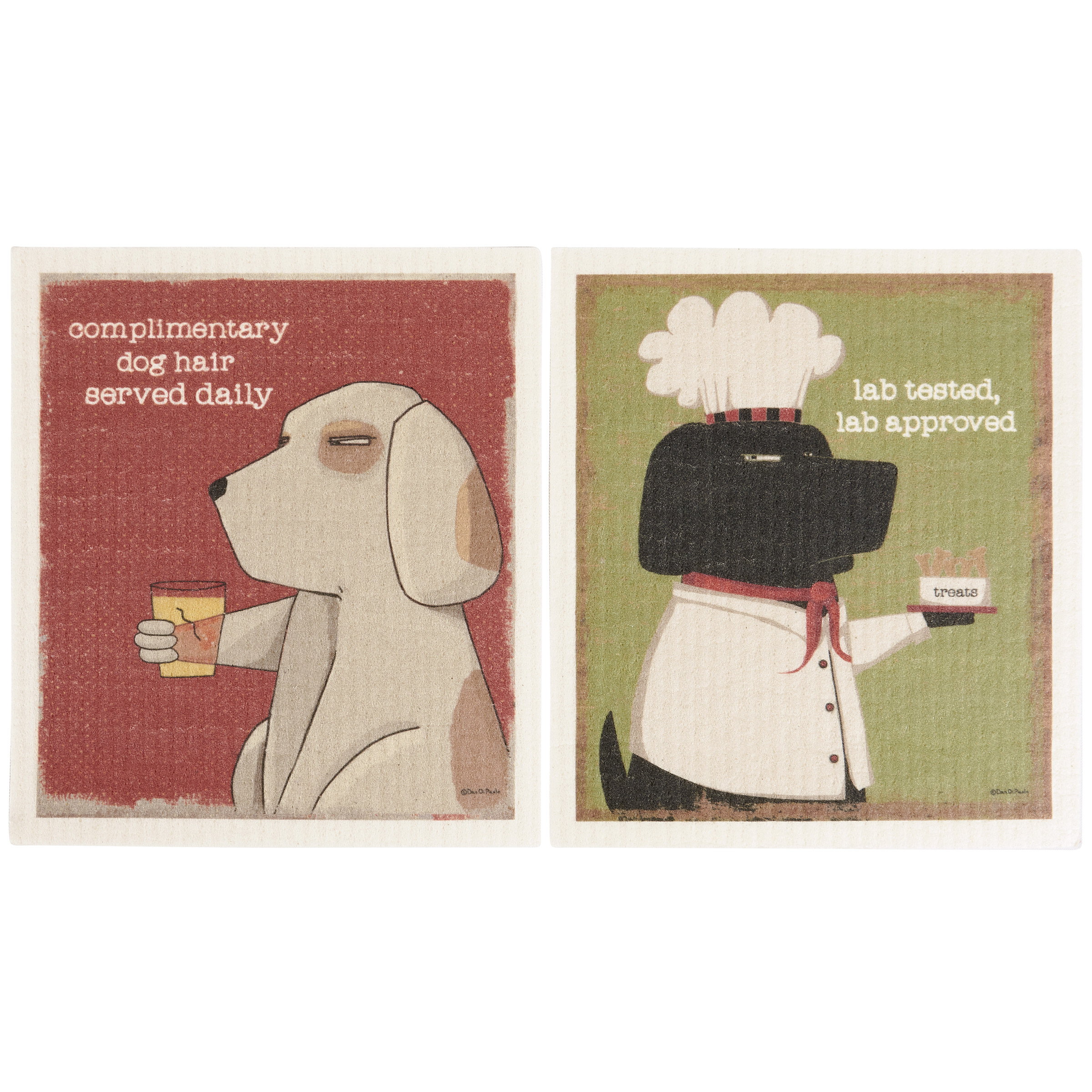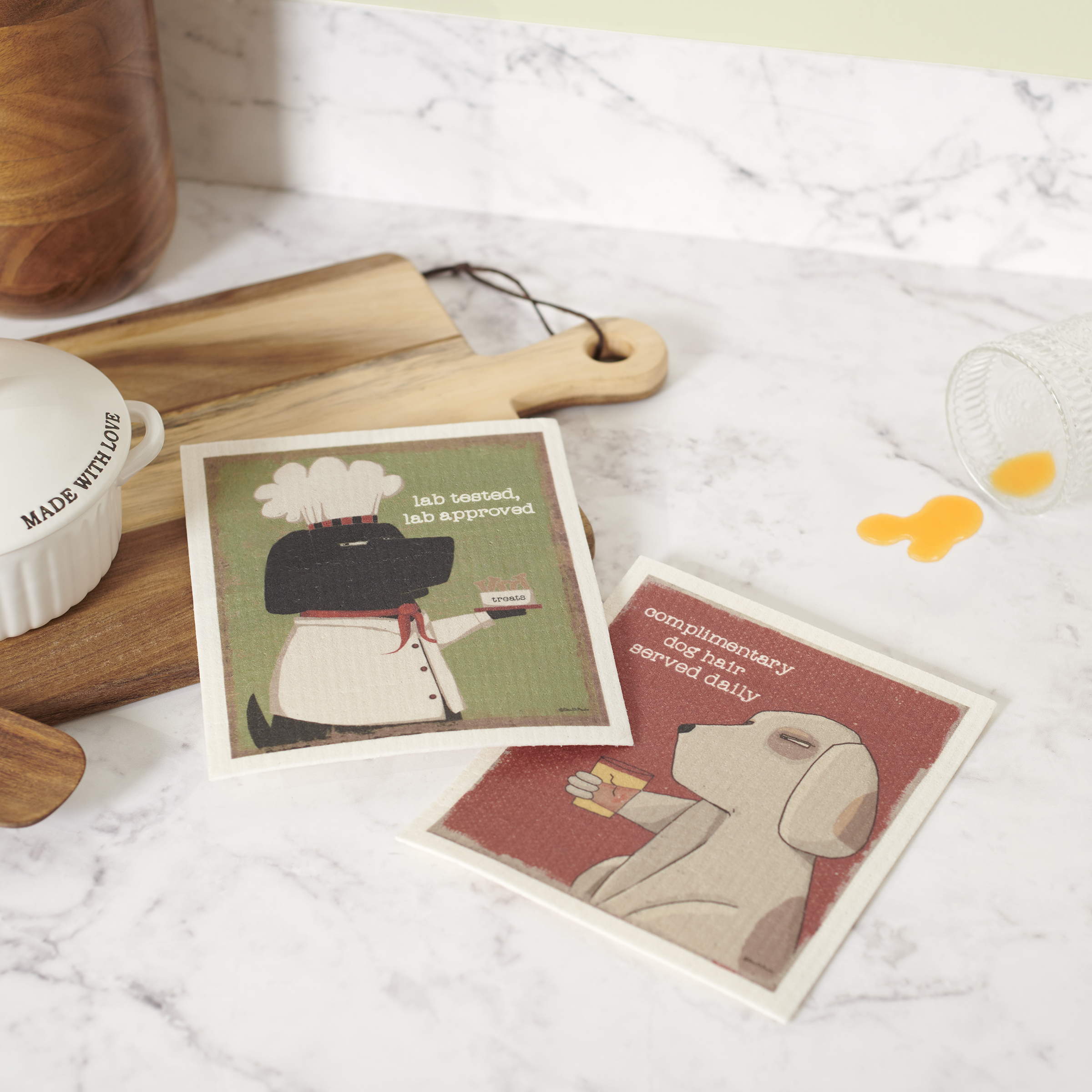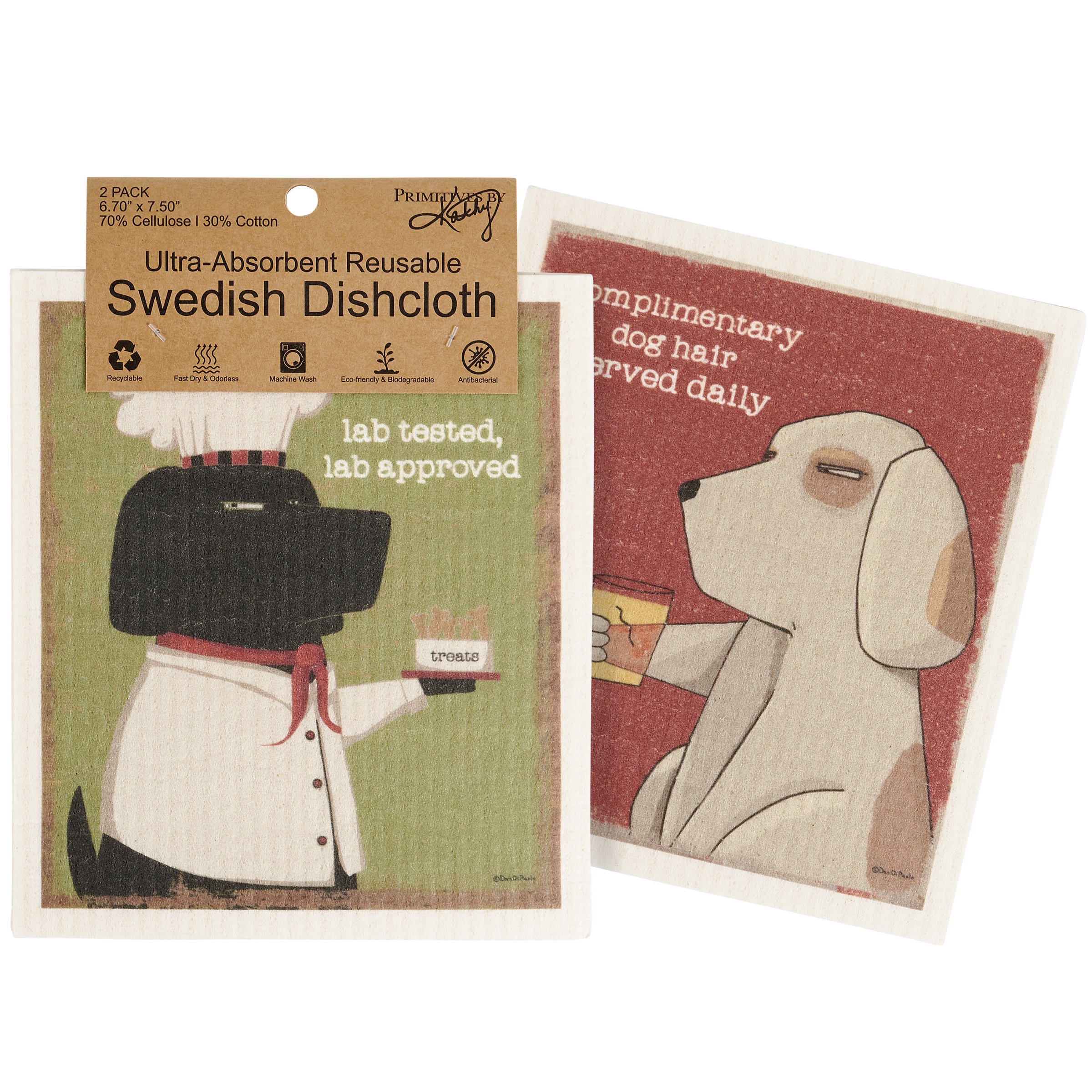 Safe to use on all types of surfaces, eco-friendly Swedish Dishcloths dry quickly and are antibacterial for more hygienic cleaning with reduced waste. This set of 2 Swedish Dishcloths from our Pets Collection features rustic designs of sassy dogs with fun pet-themed sentiments. Dog designs include a dog dressed as a chef holding treats under a "Lab Tested, Lab Approved" sentiment on one dishcloth and a dog holding a beer with a "Complimentary Dog Hair Served Daily" sentiment on the other dishcloth. Our Dogs Swedish cloth set is ultra-absorbent and conveniently machine-washable for easy cleaning and reuse. Dishcloths are attached to header card with hole for easy rack display. A sassy pet-themed set of reusable dishcloths perfect for replacing dull sponges and paper towels with long-lasting colorful designs.